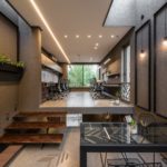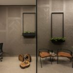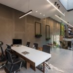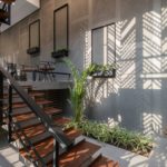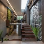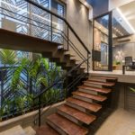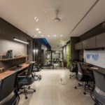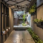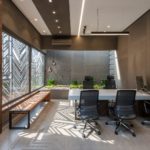 Both materially and chromatically, the office leans towards the earthy side of the scale. The complete building from outside and inside is in single tone of grey, tempered with few outlines of black — to enhance the beauty of the plants, which, along with the sunlight, are as much a part of the material palette as mild steel (window lattices, railings, customised planters), tiles (flooring) and natural wood.