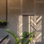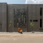 The envelope was designed as a simple trapezoidal one, echoing the shape of the plot, with a north entry and windows on the east shaded by geometric MS lattices whose design is seeded in a textile pattern they’d liked.