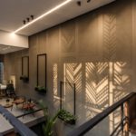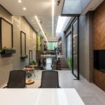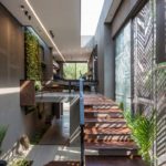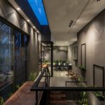 The south and the west of the corner plot abutted its neighbour, and therefore the walls along these directions had to be ‘dead’ — which proved to be a blessing as openings here would only serve to increase the internal heat load. Besides windows, sunlight, another element that the architects were keen on, was integrated into the scheme by creating slit-like punctures on the walls and a linear skylight that drew attention to and exaggerated the linearity of the structure.