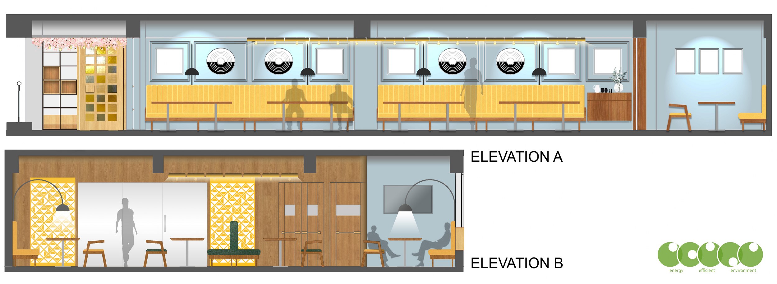 Our culture enjoys good food with good company while eating and drinking, it is also worth asking that we also eat fast food slowly. Considering this we have given space to those who prefer intimate corners, for the more reserved, we created a completely separate space for 16 people and affectionately called it “antisocial”. This private dining area is at the far end of the space. Bronze finish Round Mirror in different sizes inside the wall as an art piece, wooden geometry divide screen on both sides end with yellow color, and clear glass door placed to reflect and enlarge the space from inside.