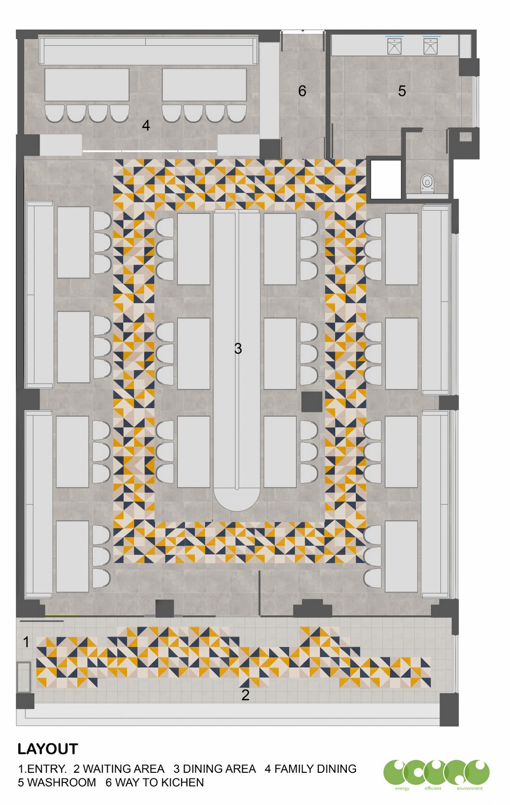 The love for restaurants is to spend a lot of time with our favorite family and friends. One of the strongest points we wanted to pay attention to was the comfort, the special look, and the feeling. The entire space is divided into two areas – the hyperactive kitchen area and the lively dining area. The kitchen is a private space to prepare delicious food. The restaurant, we achieved a seating layout of a total of 100 capacity without compromising on the essential space requirements. With proper space utilization, a relaxed seating arrangement is achieved. The furnishings too, use the same neutral-toned leather fabrics adding the entire theme of the restaurant.
