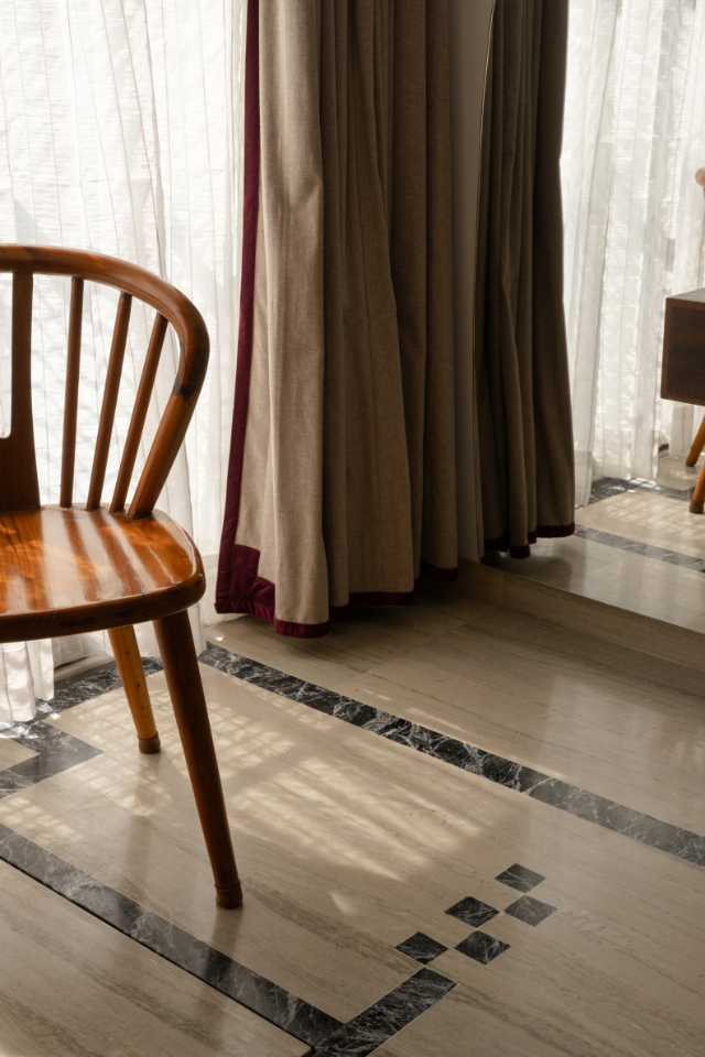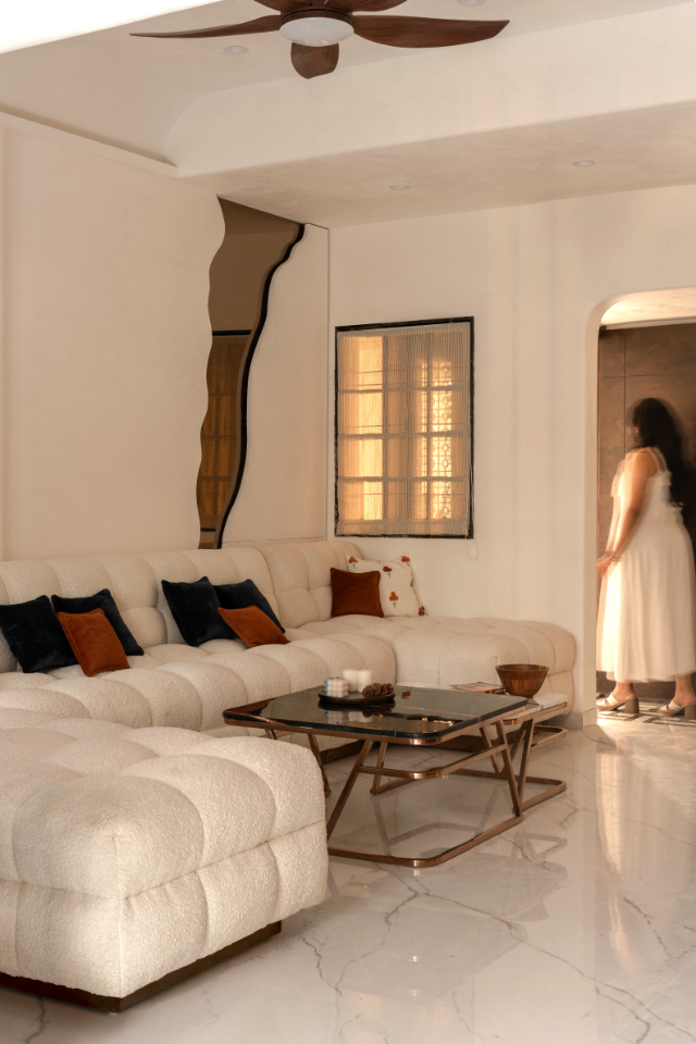 Furniture edges, walls, seating, and corners soften the existing structure. Light becomes an architectural element. A wooden screen along the staircase filters sunlight, casting subtle patterns as one moves through the space. Behind the sofa, an undulating wall reflects light differently throughout the day a quiet artwork shaped entirely by time and brightness. Nothing here shouts. Everything reveals itself slowly.