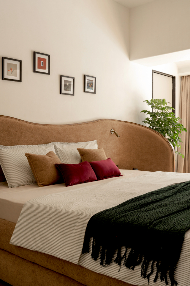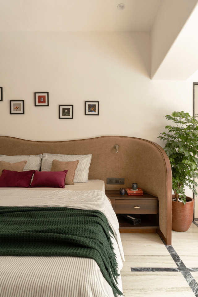 The bed was designed not just as a visual gesture, but as a functional one: soft curved “wings” provide privacy, ensuring the first view upon entering isn’t the person sleeping.