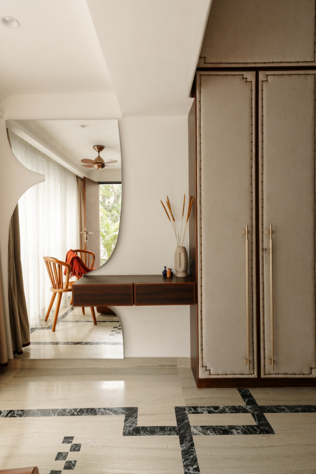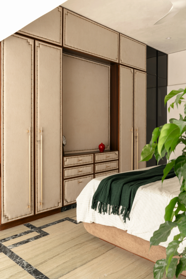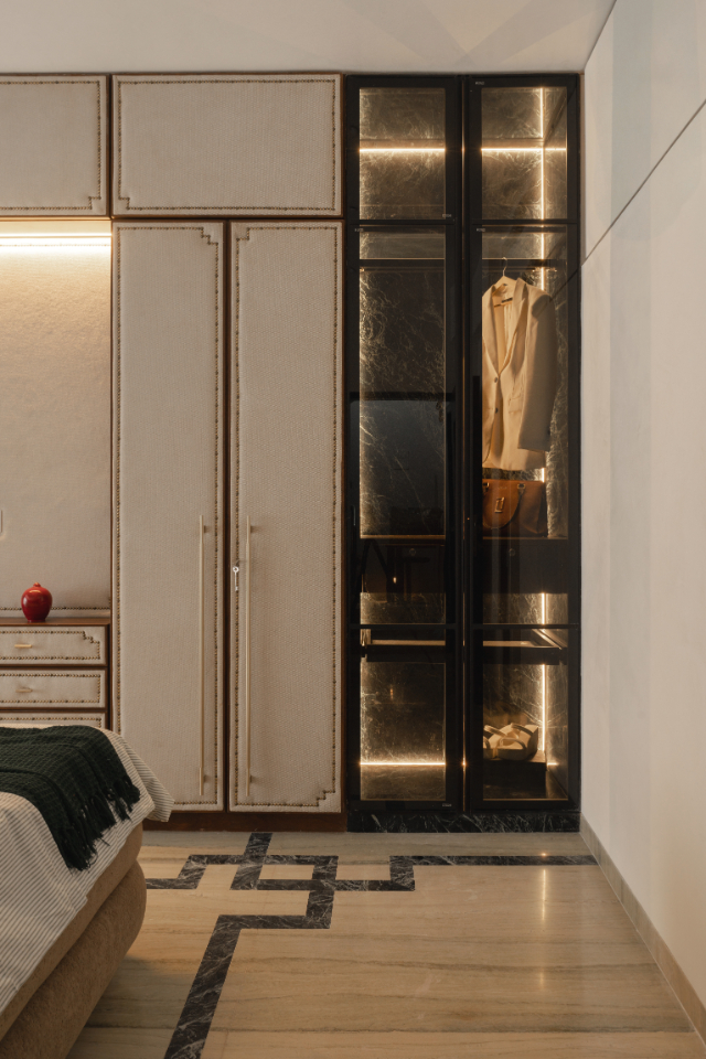 Instead of hiding this limitation, it was embraced using a Kintsugi-inspired approach. Thin green marble lines were woven into the floor, dissolving old joints and creating continuity. These lines guided everything wardrobe details, furniture edges, and the custom bed profile.