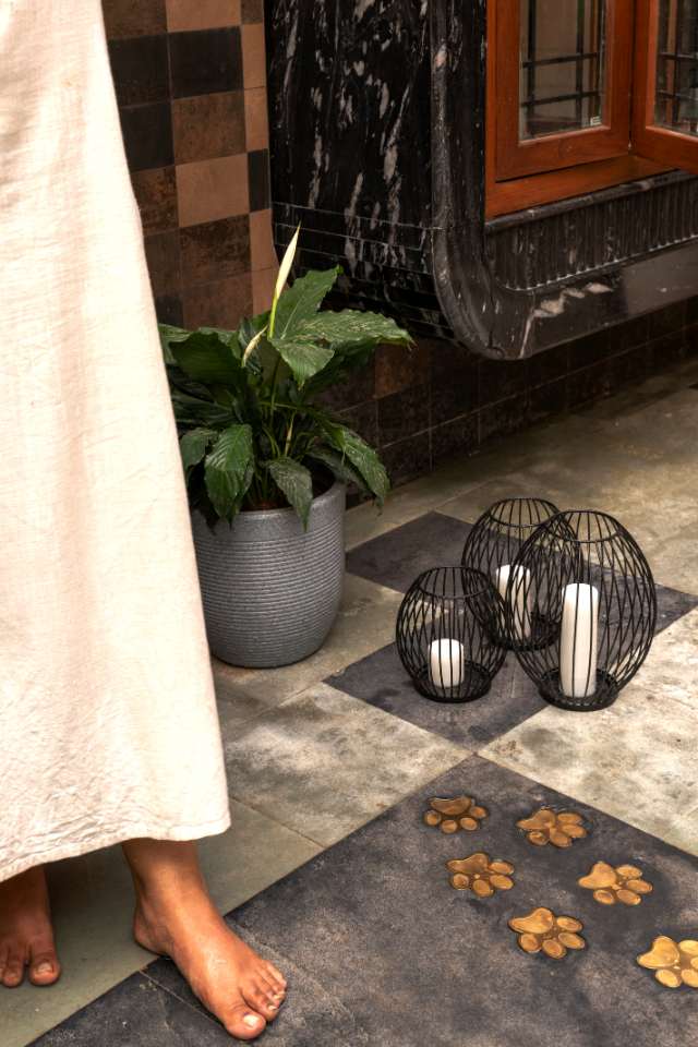 The builders completely redid the verandah flooring using timeless local materials—Kota stone and Kadappa stone—laid in a random yet synchronised pattern. The layout follows movement rather than symmetry, guiding one naturally towards the entrance of the house. With the smoothness of pebbles, creating a tactile contrast beneath the feet. Planters and softscape emerge from the tree’s corner, framing it as the nurturing anchor of the space.The designers engraved steel inlays in the shape of falling flowers into the flooring, echoing the petals shed by the tree above. Like a Frozen time. Importantly, the designers made the flooring forgiving. If the tree ever pushes through again, workers can remove and reset individual tiles without disturbing the overall design. The same random logic extends to the wall tiles, with darker tones at the bottom for ease of maintenance and a quiet acknowledgement of Mumbai’s dust-filled reality.
