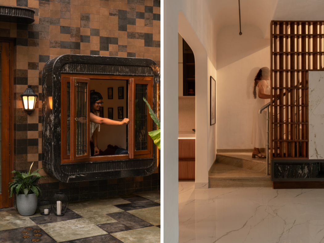 Across from it sits its quiet companion: a slanted dining window, finished in the same material but expressed differently. Together, these two windows speak to each other similar, yet distinct sharing light, views, and material language. Entry into the house happens through the original teakwood door, refurbished and reused. It has been part of the home since the beginning, and it felt right to let it continue its journey.