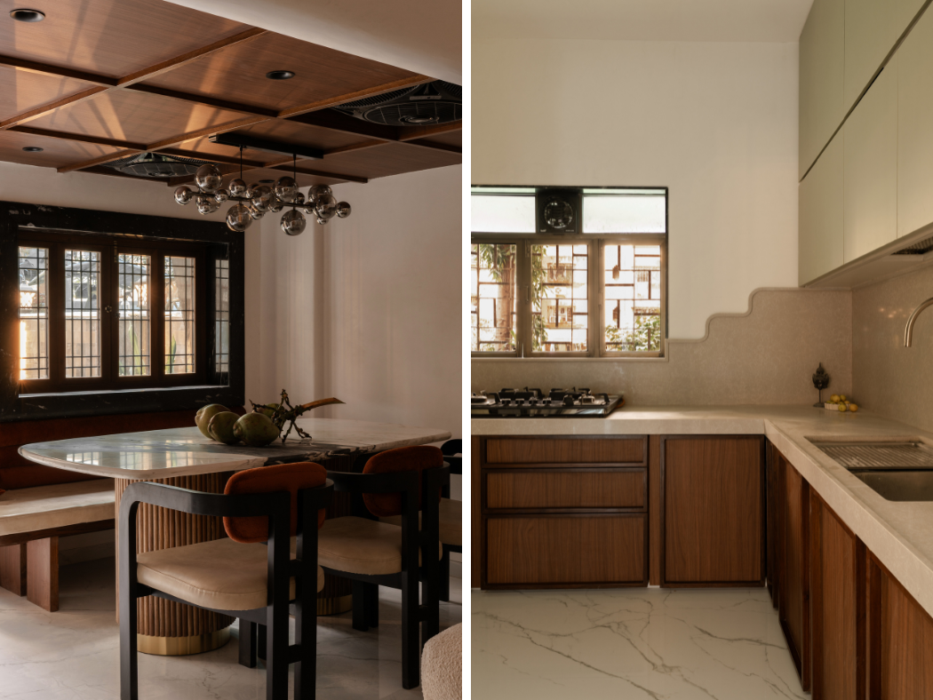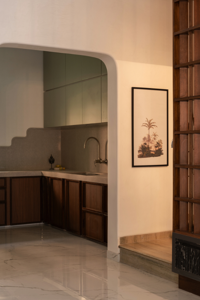 The kitchen sits across a wide opening from the living area visible, accessible, and seamlessly part of the home. Instead of treating it as a leftover space, it was stripped back to its essentials. A single window anchors the space. To soften its strict lines, curves from the living area continue into the stone backsplash, turning it into a subtle sculptural element. Lower cabinets in warm walnut ground the kitchen, while overhead shutters in a muted sage tone bring calm. The kitchen doesn’t try to stand out. It blends in functional, warm, and quietly confident. It feels less like a workspace and more like an extension of everyday life.