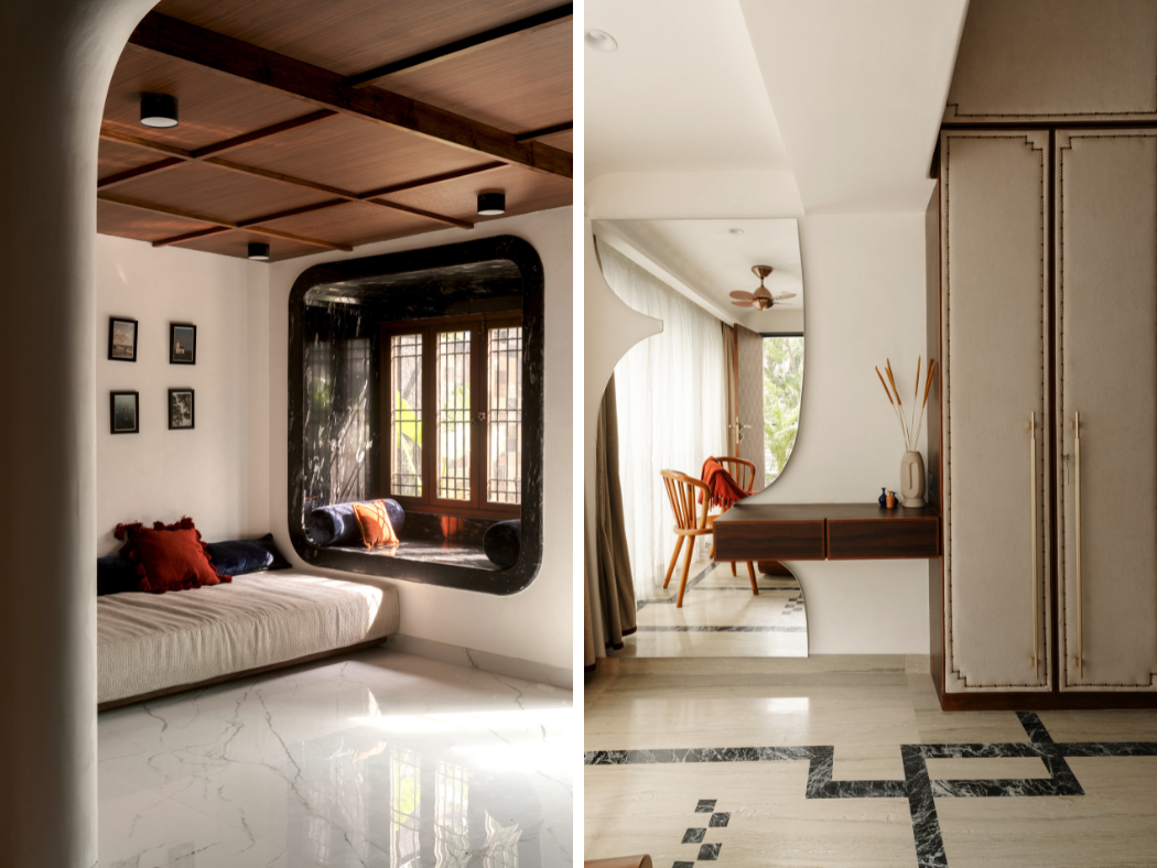 Even with all the detailing in the garden, one’s attention inevitably drifts to the curved baithak window overlooking it. Clad in black granite sourced from Rajasthan, the bay window gently projects outward, becoming both furniture and architecture. It’s a place to sit alone or share a morning coffee. The masons loved building it not because it was complex, but because it made sense to the body.