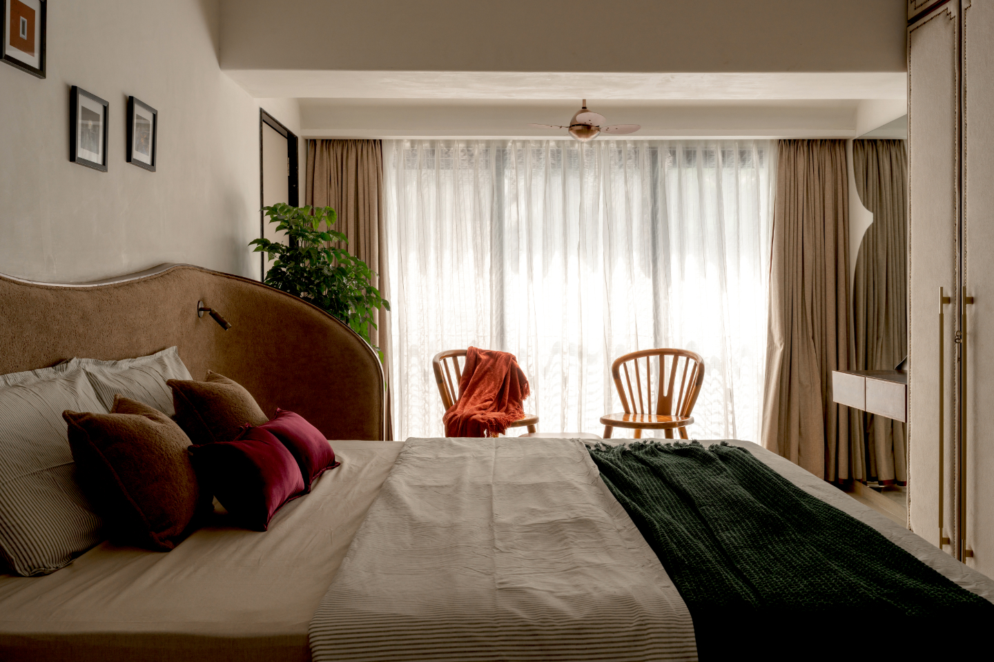 As the project evolved, the scope naturally extended upstairs to include the master bedroom and mandir. Upstairs, the home shifts into a softer, more personal rhythm. The master bedroom originally opened to a heavy wall of storage functional, but overwhelming. Like many clients, the instinct was to maximise storage wherever possible (a logic we noticed… and chose not to question further).