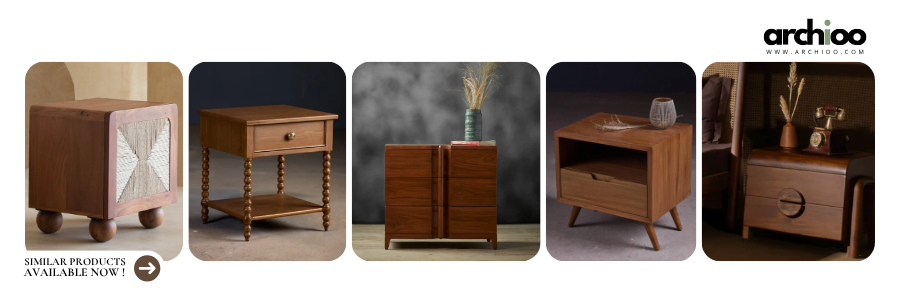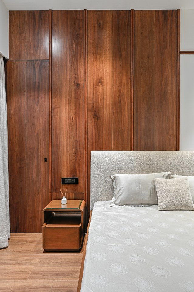 Lighting plays a key role here — recessed spotlights emphasize the textures on the wall, while warm-toned ambient lighting creates a soothing atmosphere. The bedside tables, featuring curved wooden drawers and glass tops, echo the design continuity seen throughout the home.
