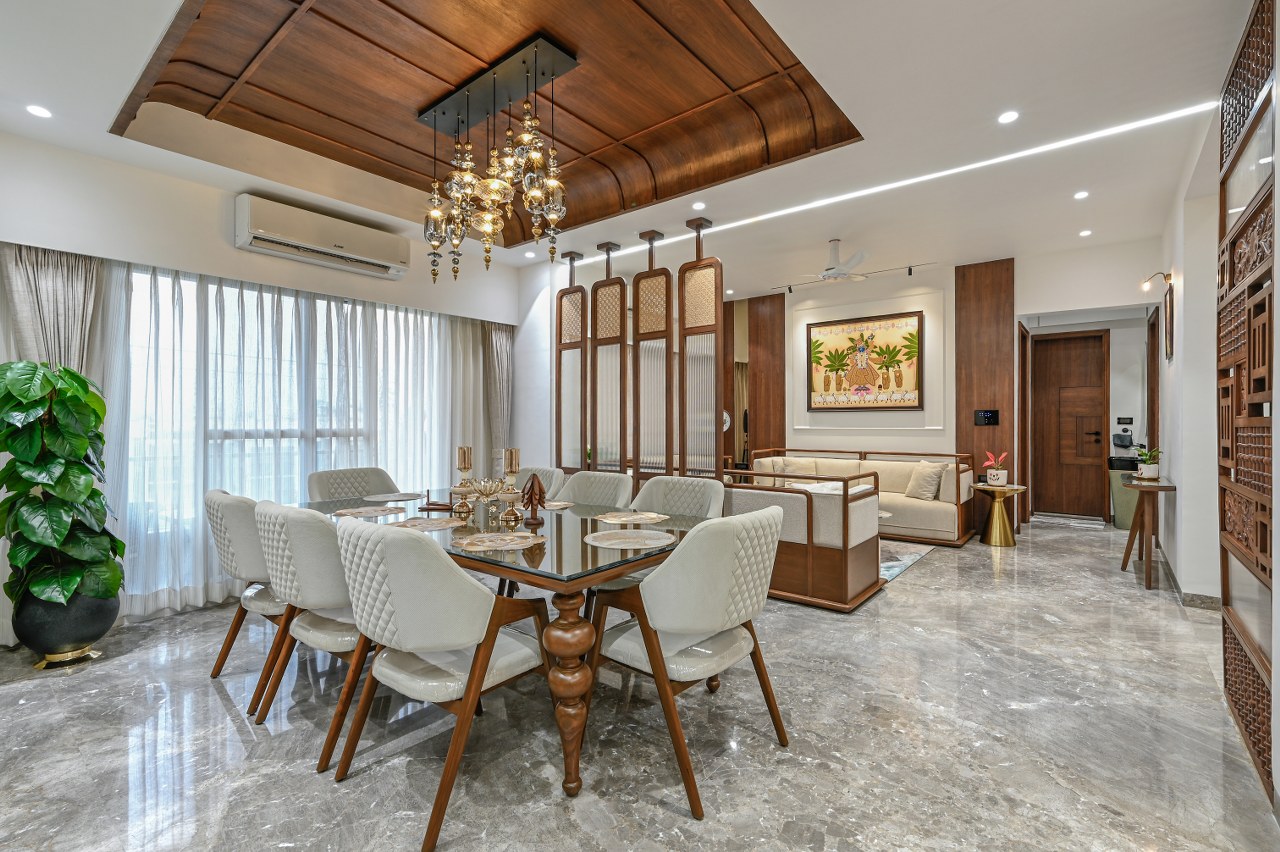Behind the dining area, a decorative wooden screen with fluted glass inserts acts as a semi-transparent divider. This not only enhances privacy for the adjacent lounge but also becomes a statement design feature, adding rhythm and texture. The fluted glass allows light to filter through softly, preserving the airiness of the layout.