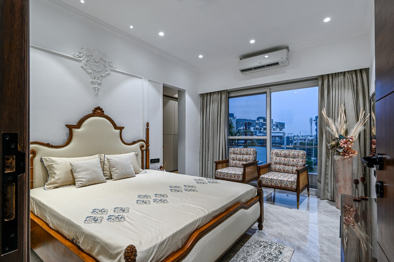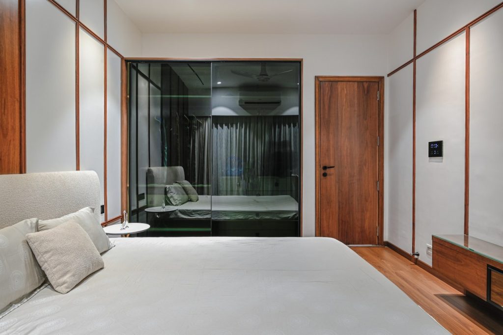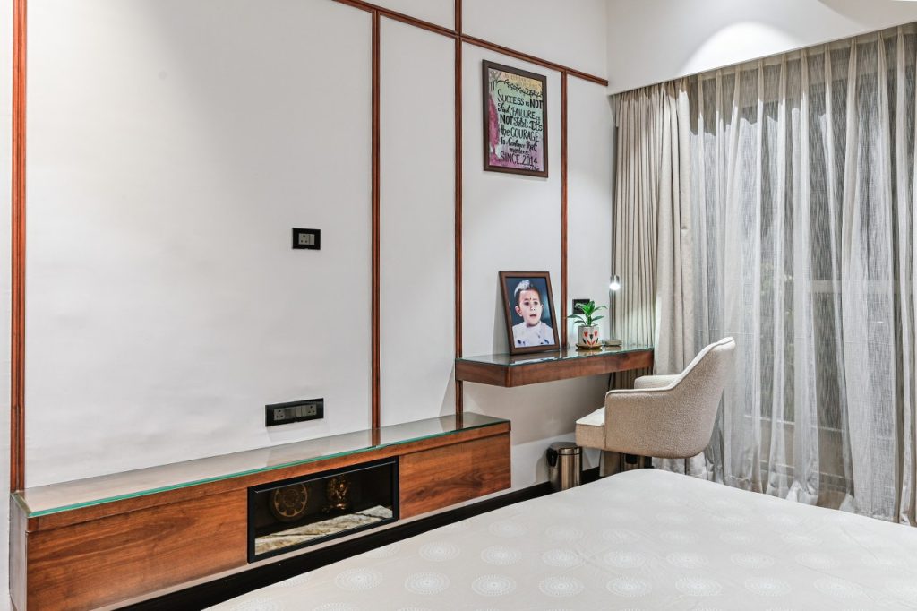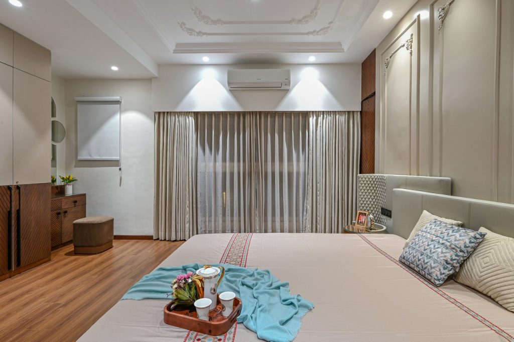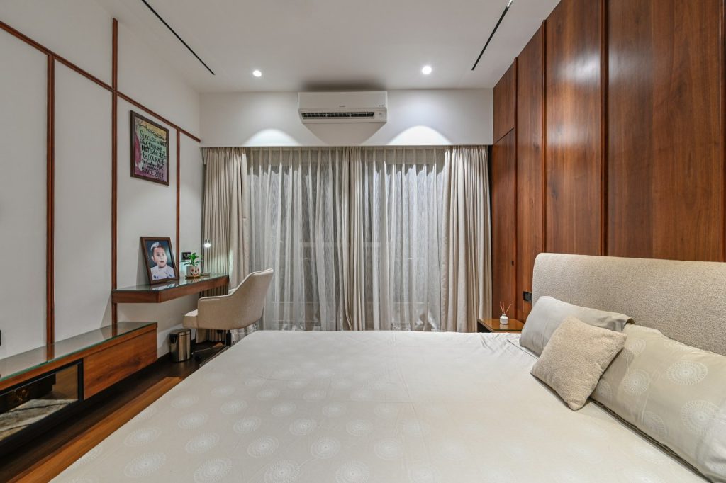 The guest bedroom continues the design ethos of subtle sophistication. Here, traditional wooden furniture with carved bedposts coexists with sleek modern details like the floating TV unit in glass and wood. The large window ensures natural light, complemented by elegant drapes that match the home’s soft palette.