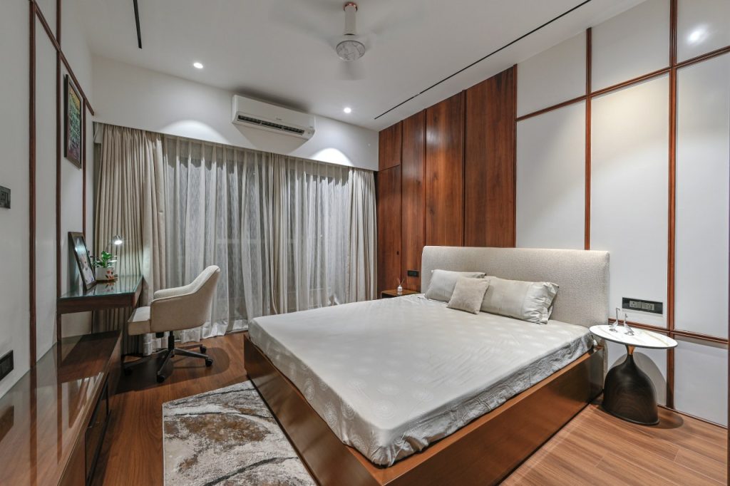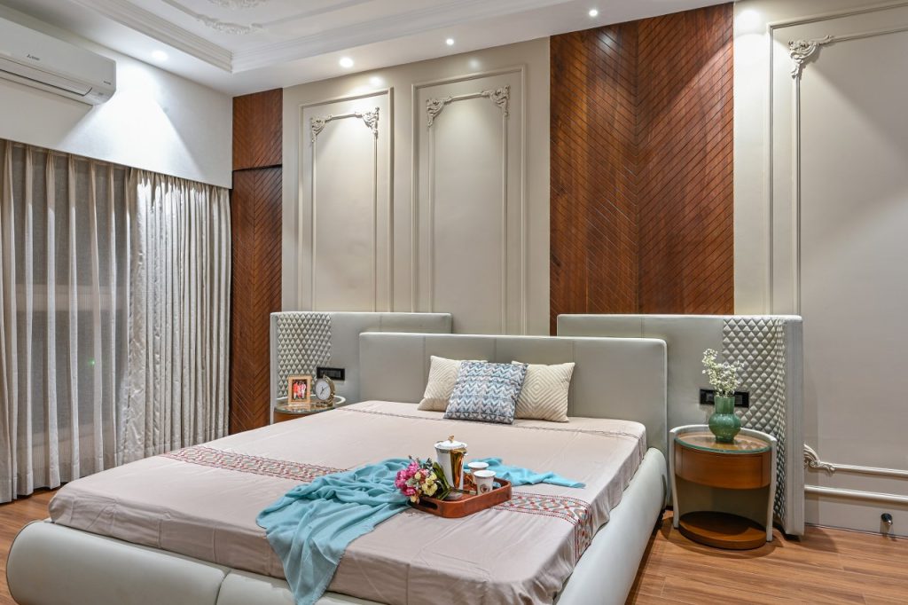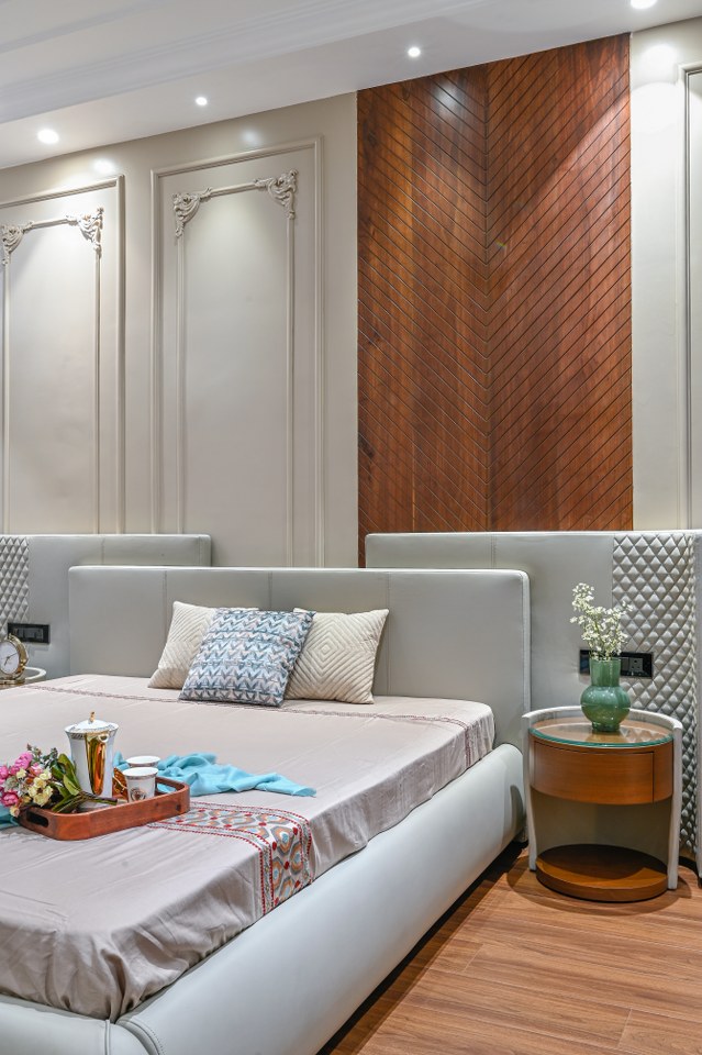The master bedroom is a sanctuary of comfort, defined by elegant minimalism and layered textures. The bed, with its upholstered frame and soft leather finish, anchors the space. The wall behind it showcases a combination of panel molding and wooden chevron cladding, offering a luxurious yet warm aesthetic. The detailing adds subtle drama, blending classical ornamentation with contemporary geometry.