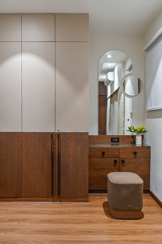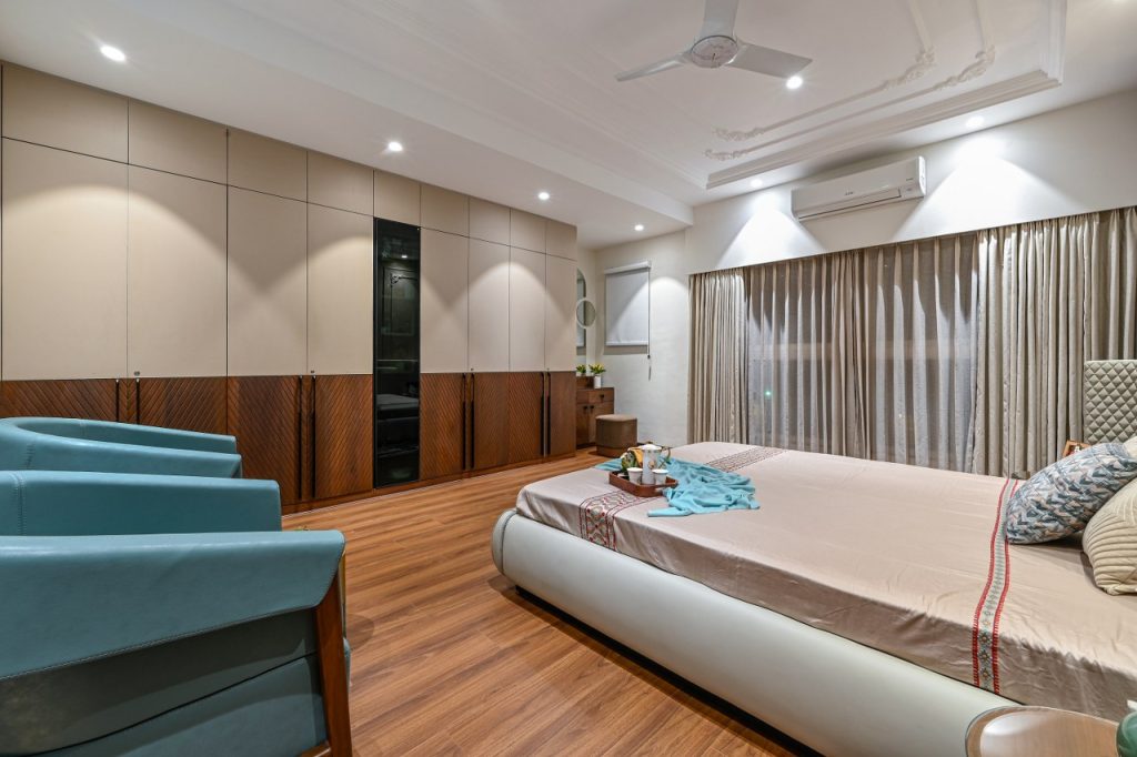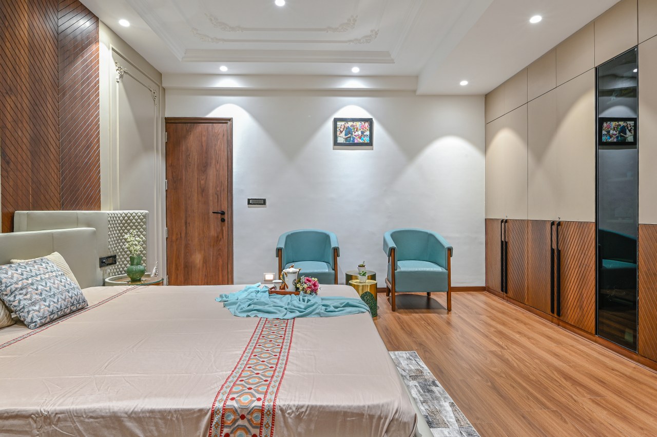 Along one wall, floor-to-ceiling wardrobes feature dual finishes — a combination of matte beige and chevron-patterned wood veneer — blending utility with high design. Their sleek, handle-less design maintains the clean visual lines of the space. A pair of teal-blue accent chairs introduce a pop of color, subtly breaking the neutral monotony while adding a lounge-like comfort area within the bedroom.