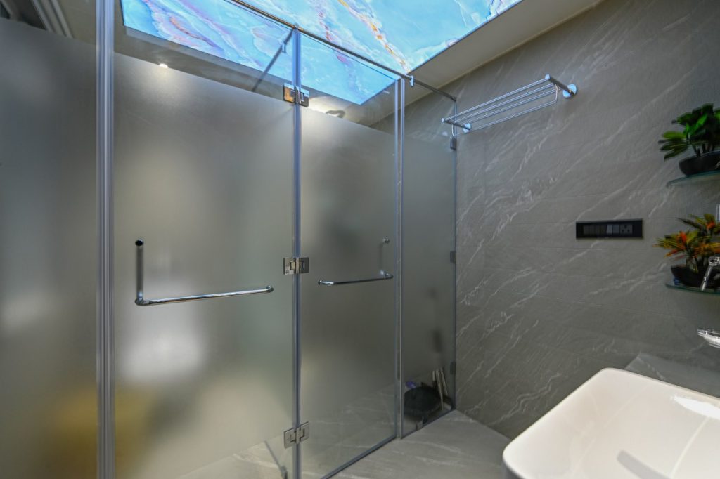The ceiling design deserves special mention — sleek recessed lighting and a subtle ceiling fan maintain a minimalist look while ensuring practicality. The concealed lighting highlights the textured wall and adds a soft glow to the room. The introduction of indoor plants, such as the lush greenery near the window, breathes life into the environment and balances the modernity of the marble and glass with organic freshness.