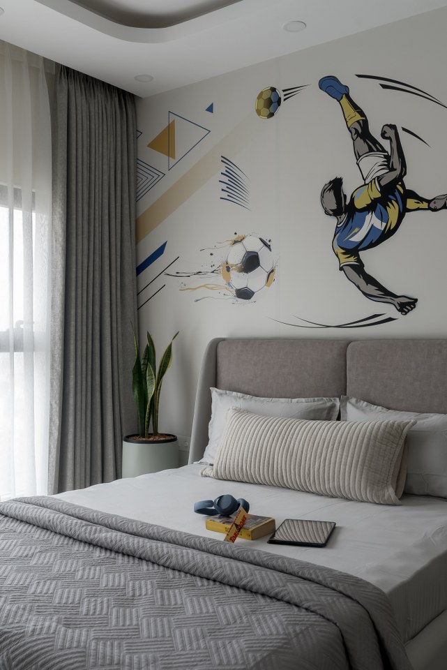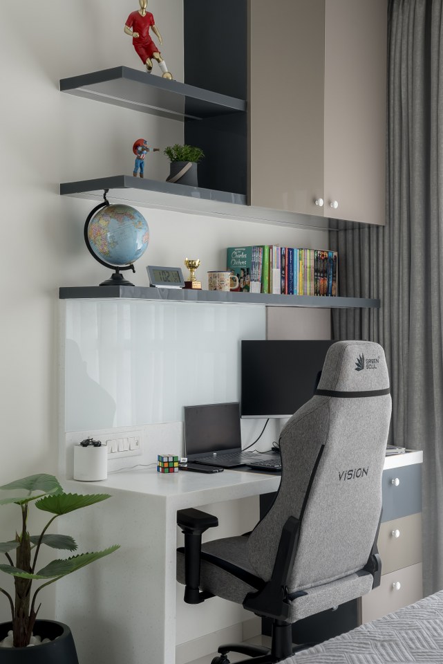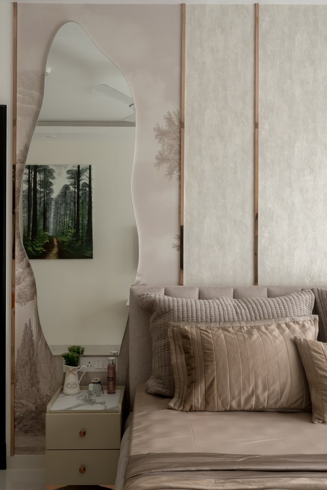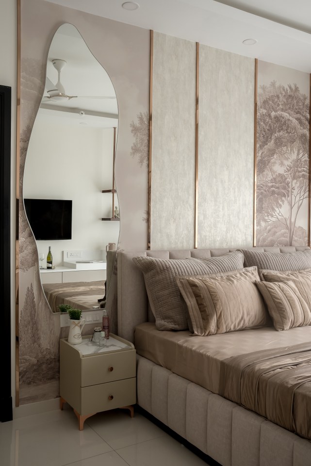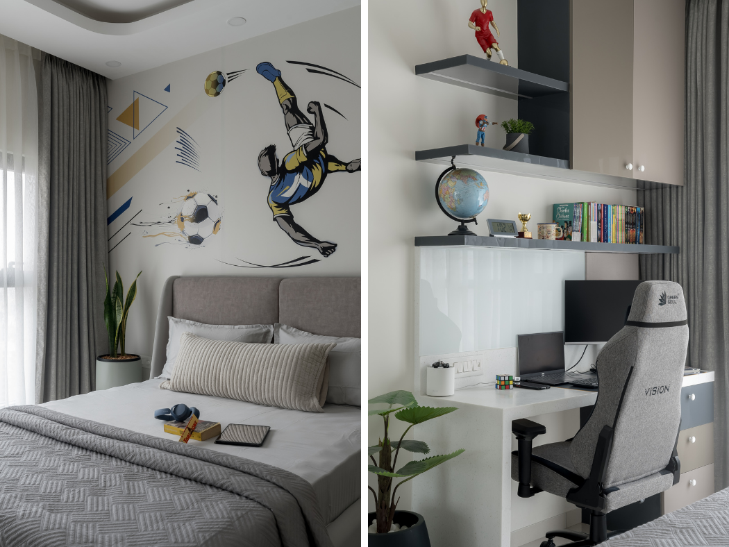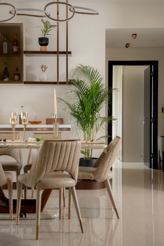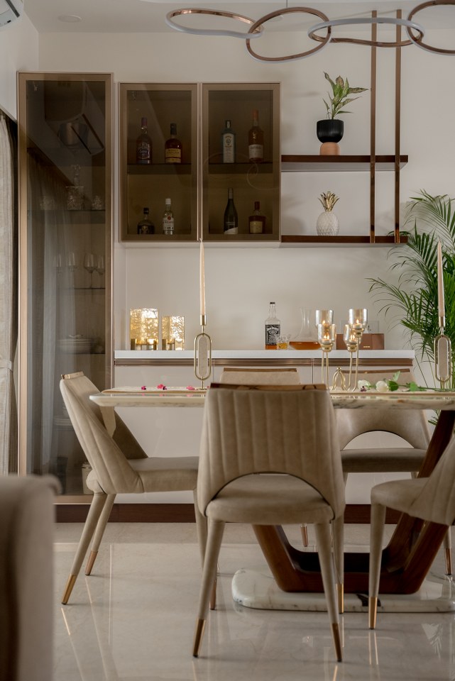 The dining area is styled with contemporary furniture, a bespoke buffet, and golden touches that resonate with the chandelier and art, creating a sculpted sense of cohesion. Bedrooms are deeply personal, with textured headboards, statement walls, and mood lighting tailored to each occupant’s story. The modular kitchen embodies streamlined functionality, its tones echoing the larger palette of the home.