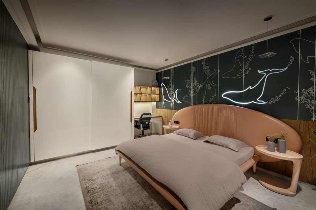 The daughter’s room is a delightful combination of soft pink and green hues. It creates a space that feels both playful and graceful. The room’s delicate aesthetic is elevated by accents of Corian stone in the study and shelving areas. They add a refined, durable touch. The careful selection of materials and colours ensures that the room remains both charming and functional for the growing child.