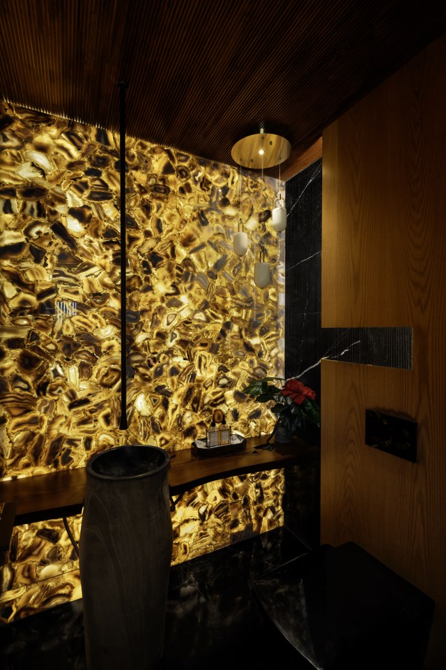 The powder room is nothing short of luxurious, designed as a jewel box with semi-precious stone surfaces that elevate the space with rich texture and natural elegance. The accent wall, adorned with intricate stone patterns, creates a stunning focal point that draws the eye. The luminous quality of the stone adds to the room’s opulent feel, while a standing wash basin crafted from natural materials complements the design. This organic touch brings warmth and uniqueness to the powder room, making it both artfully curated and opulent.