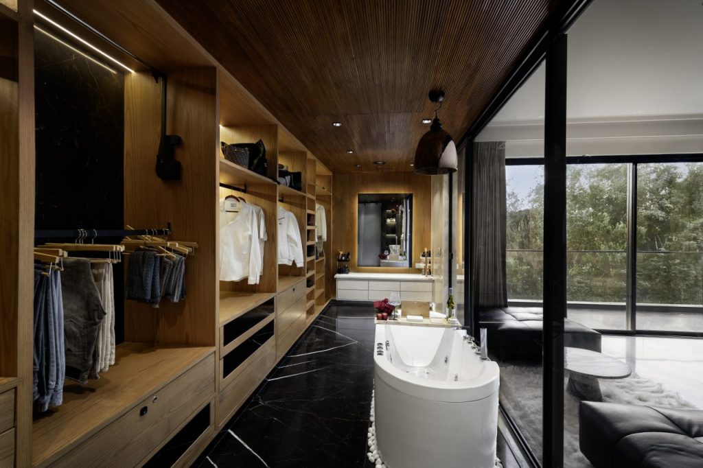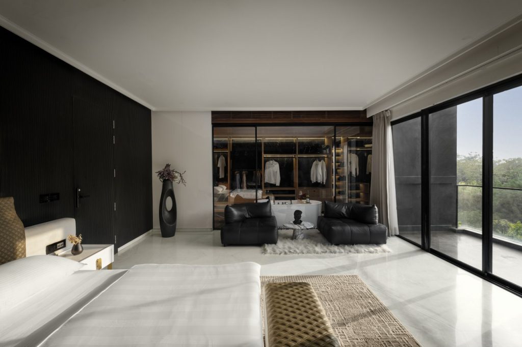 The master bedroom blends modern elegance with comfort, featuring bold geometric design elements, expansive park-view windows, and a stylish seating area. The design offers both sophistication and relaxation, with a generous walk-in wardrobe and a luxurious open-plan bathroom. The bathroom, complete with a freestanding tub and sleek stone finishes, enhances the room’s upscale, contemporary appeal, providing the perfect private retreat.