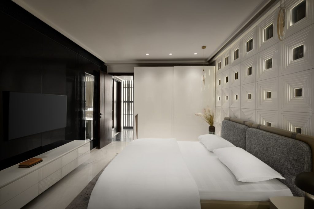 The parents’ bedroom offers a serene retreat, designed with neutral tones and geometric patterns in the bed’s backdrop to create a calm, sophisticated atmosphere. The space promotes restful tranquility, perfect for unwinding at the end of the day.