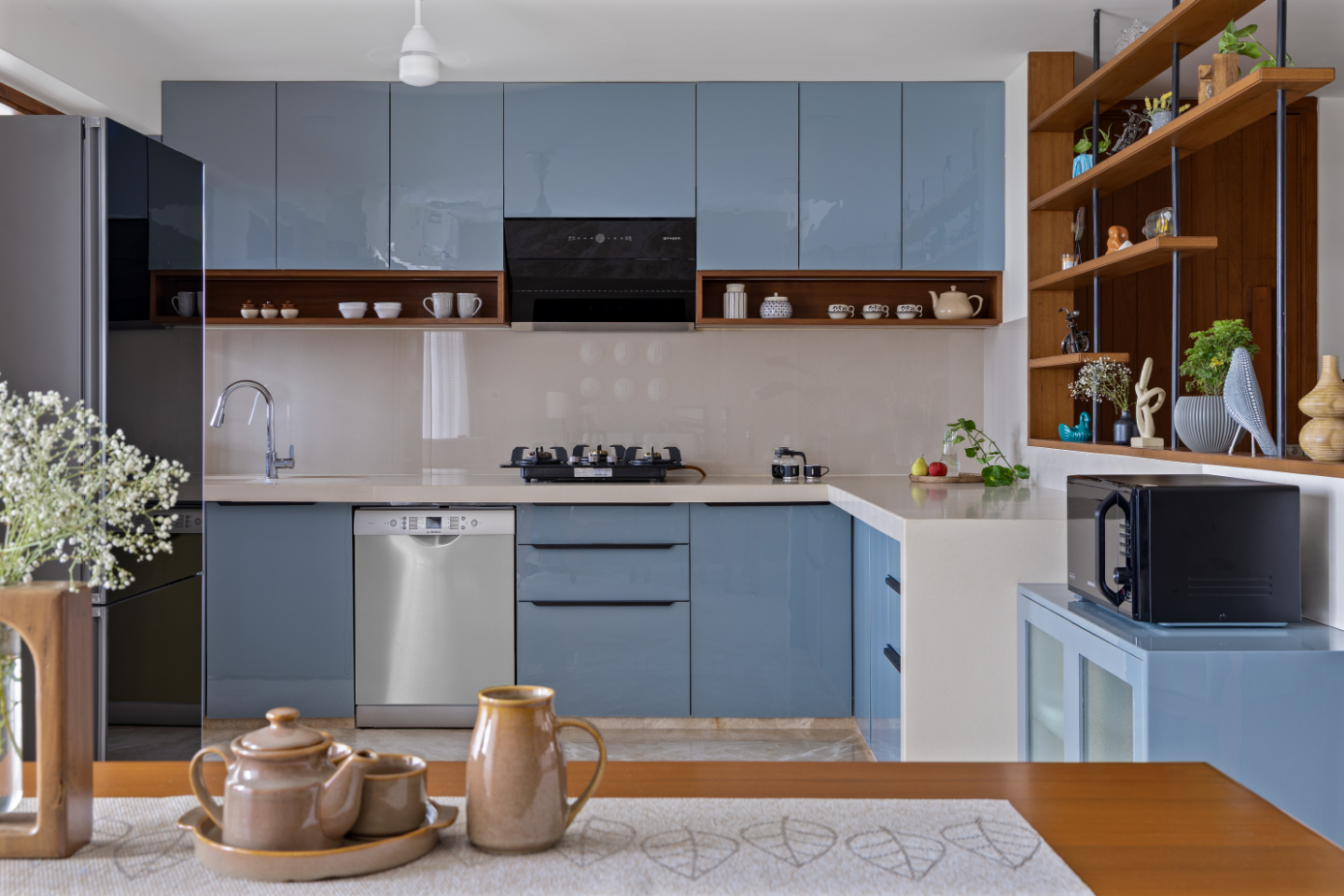 The colour and material palette is deliberately understated. Wooden furniture pieces stand in gentle contrast to the quiet luxury of beige Italian marble, adding warmth to the space. Soft hues – white, light grey, and the muted dove blue of the kitchen cabinets create a calm and soothing atmosphere. Thoughtfully placed artefact like the customized ceramic wall sculptures lend a sense of individuality to the space.