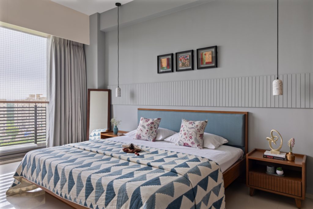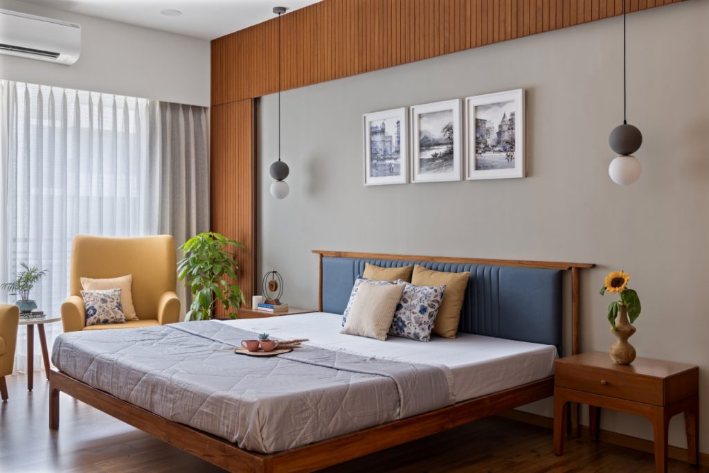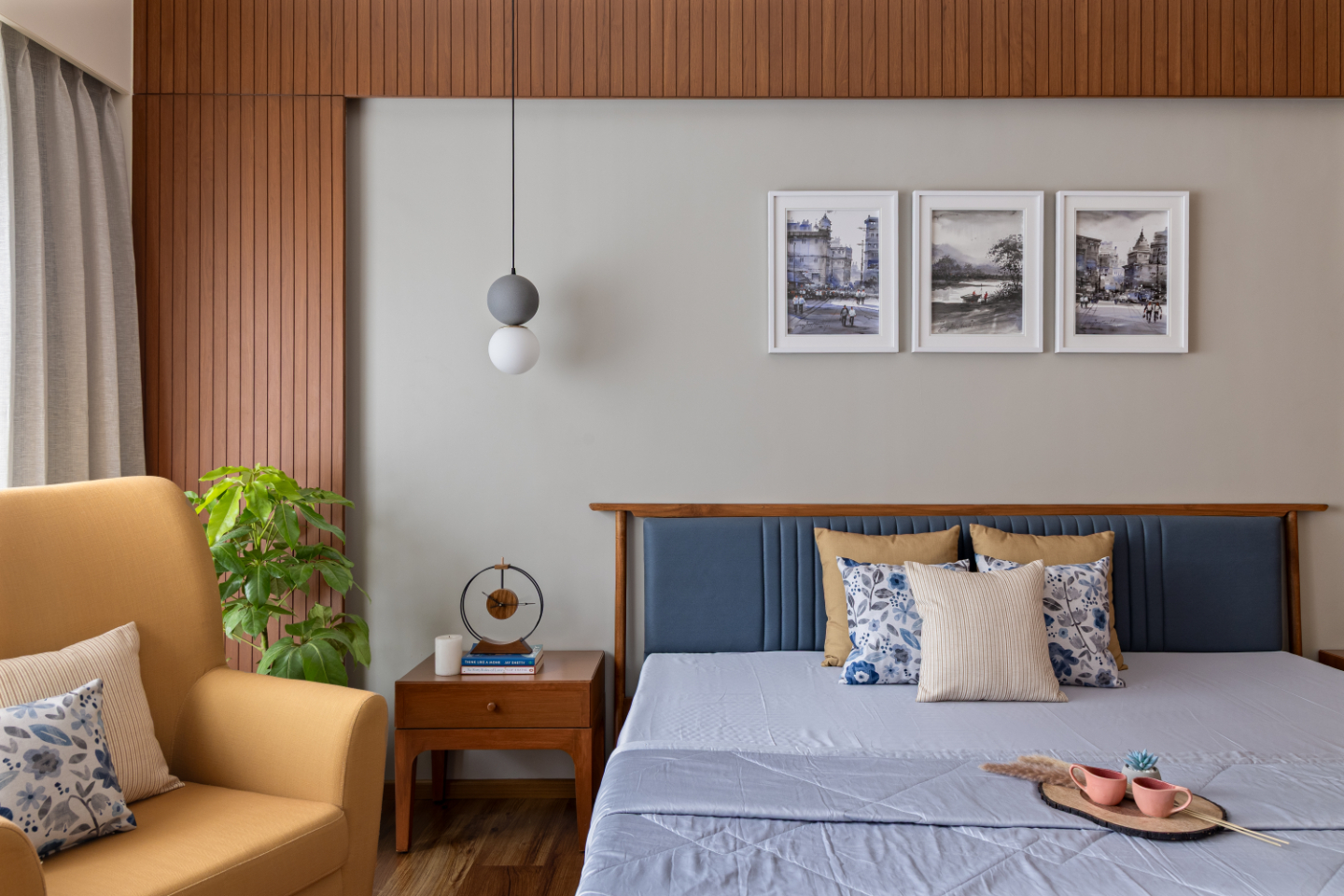 Wooden flooring and soft furnishings in bright shades of blue and yellow complement the space. Vertical rhythm continues the language here as well, complemented by a compact study nook crafted in wood place neatly in one corner, blending with the room’s material palette while offering a quiet spot for work and reflection.