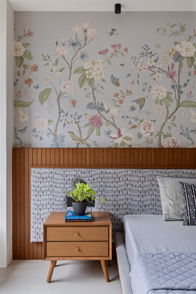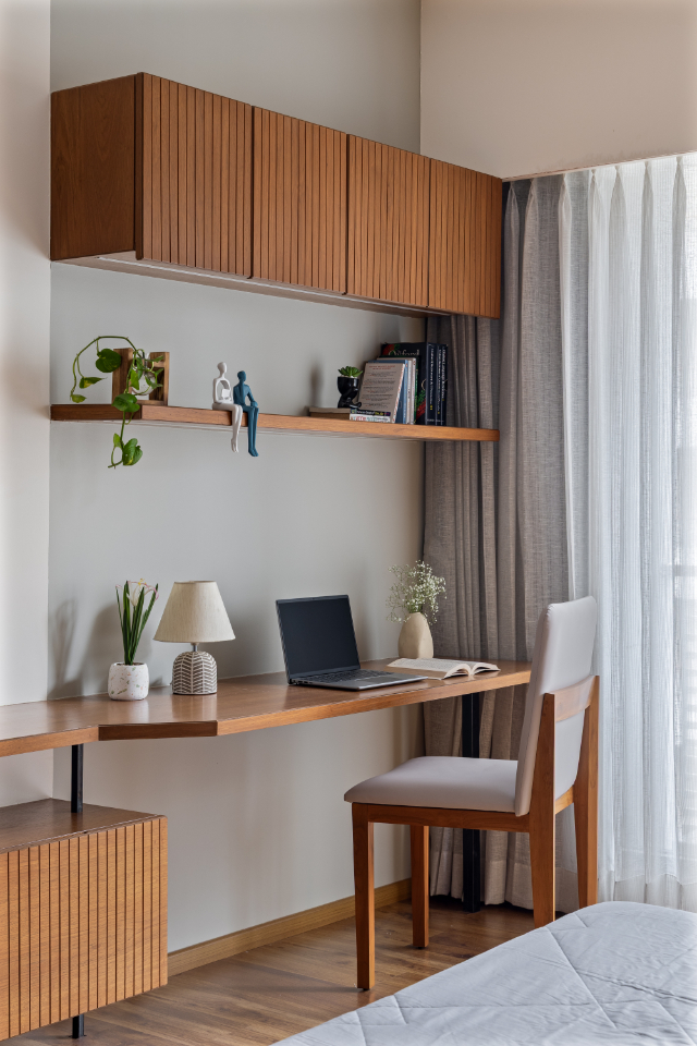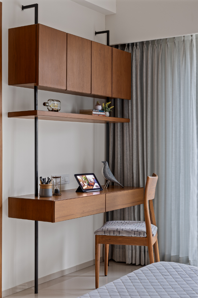 In the son’s bedroom, a nature-inspired wallpaper adds a playful touch. It’s paired with wooden paneling that continues the material language seen throughout the home, adding warmth and visual continuity to the room. The study table in this room is a nod to the kitchen partition, made of wood with slim black vertical rods, tying it back to the rest of the home while giving the room its own character.