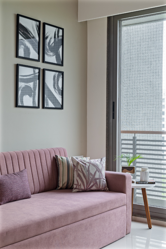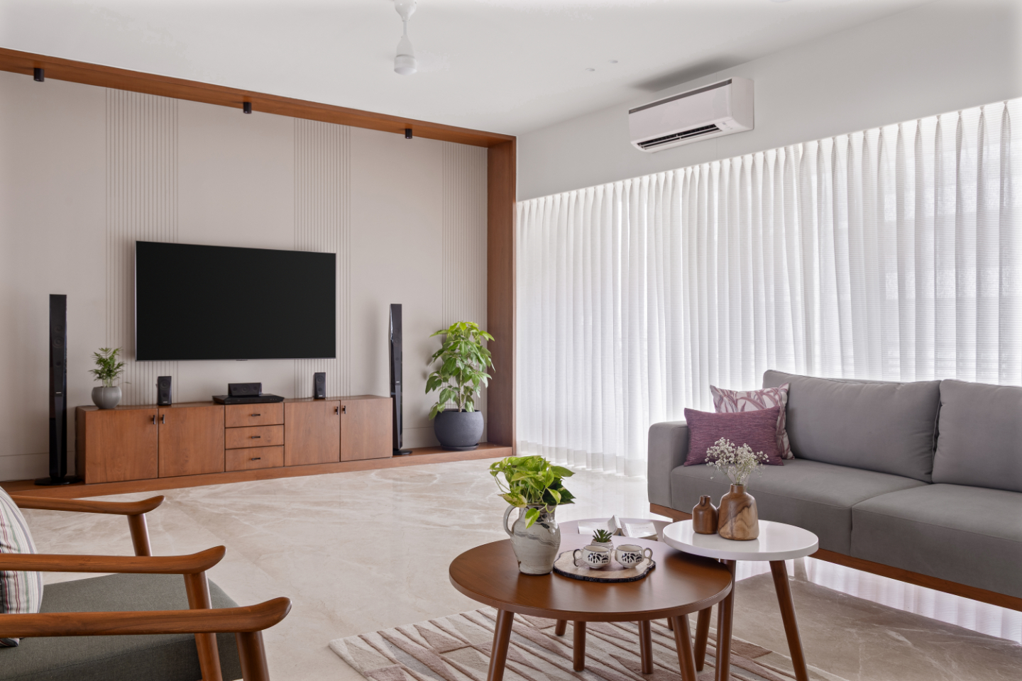 This seamless expanse acts as a grounding canvas. Its polished surface reflects soft daylight throughout the interiors. Light gently filters in through the balcony adjoining the living room, enhancing the feeling of openness and calm. The marble extends beautifully along the living room wall, further emphasizing this sense of continuity.