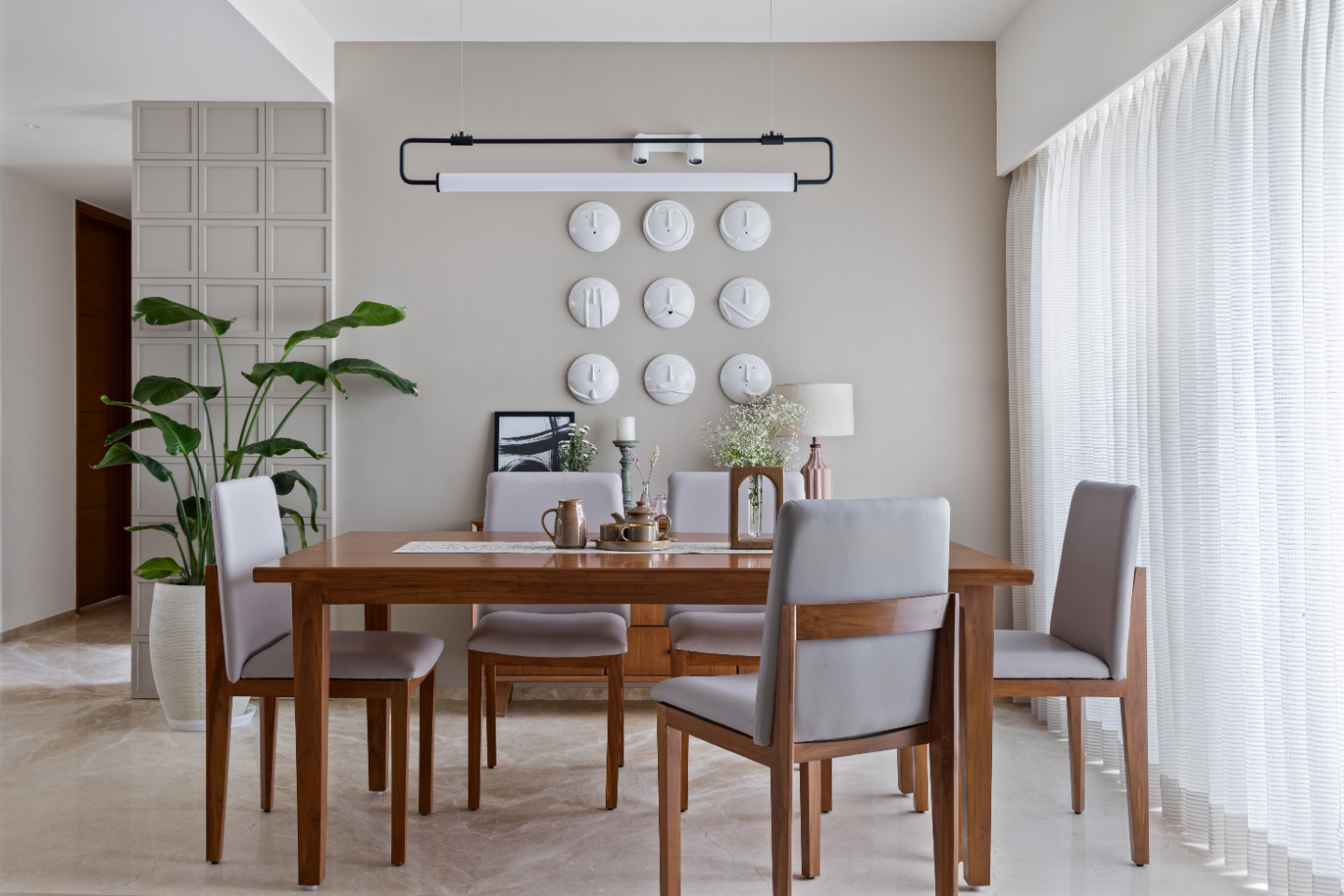 This quiet abode, spanning 2000 square feet, exudes a sense of calm and minimal aesthetic, the moment one enters. It ushers you into a foyer that stretches into the distance, drawing the eye to a softly illuminated, adorned wall at the far end, while the dining and living spaces unfold gently on either side. The subtle stretch of beige Italian marble across the floor brings a sense of continuity and understated elegance to the space.