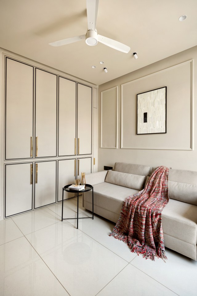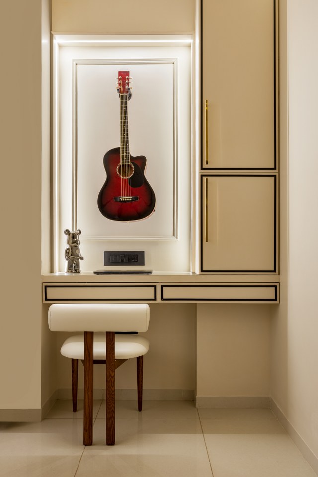 The guest room is designed as a versatile space that functions as a study, entertainment room, and occasional bedroom. European-inspired MDF framing, matte beige acrylic finishes, and black-and-gold metal accents give the room a refined character, while a sofa-cum-bed and integrated study setup ensure functionality. Personal details, such as a framed guitar display within the study area, add an individual and expressive layer to the space.