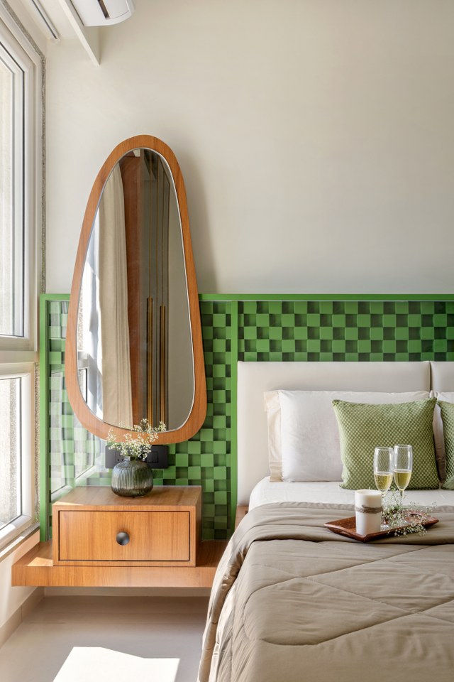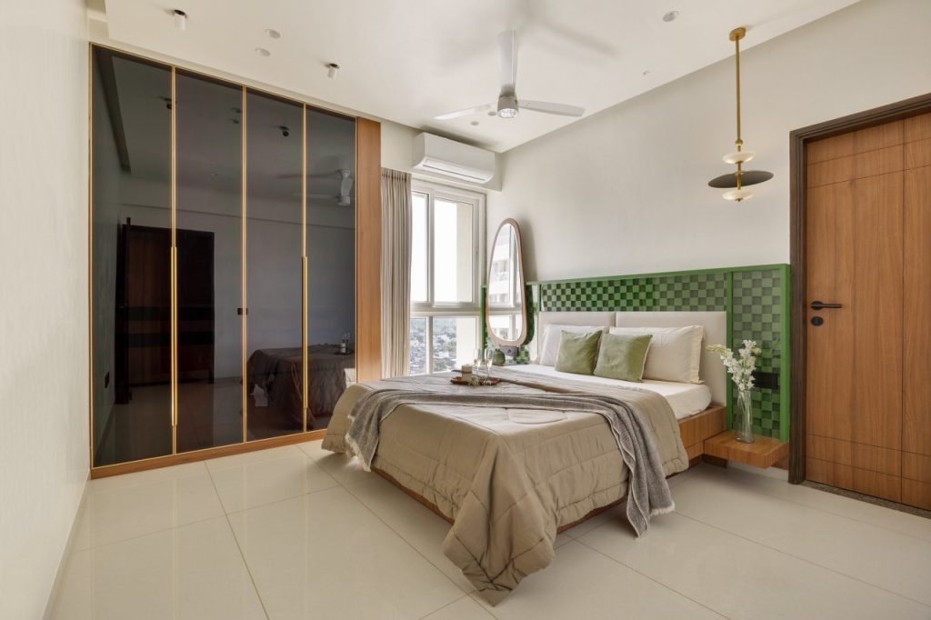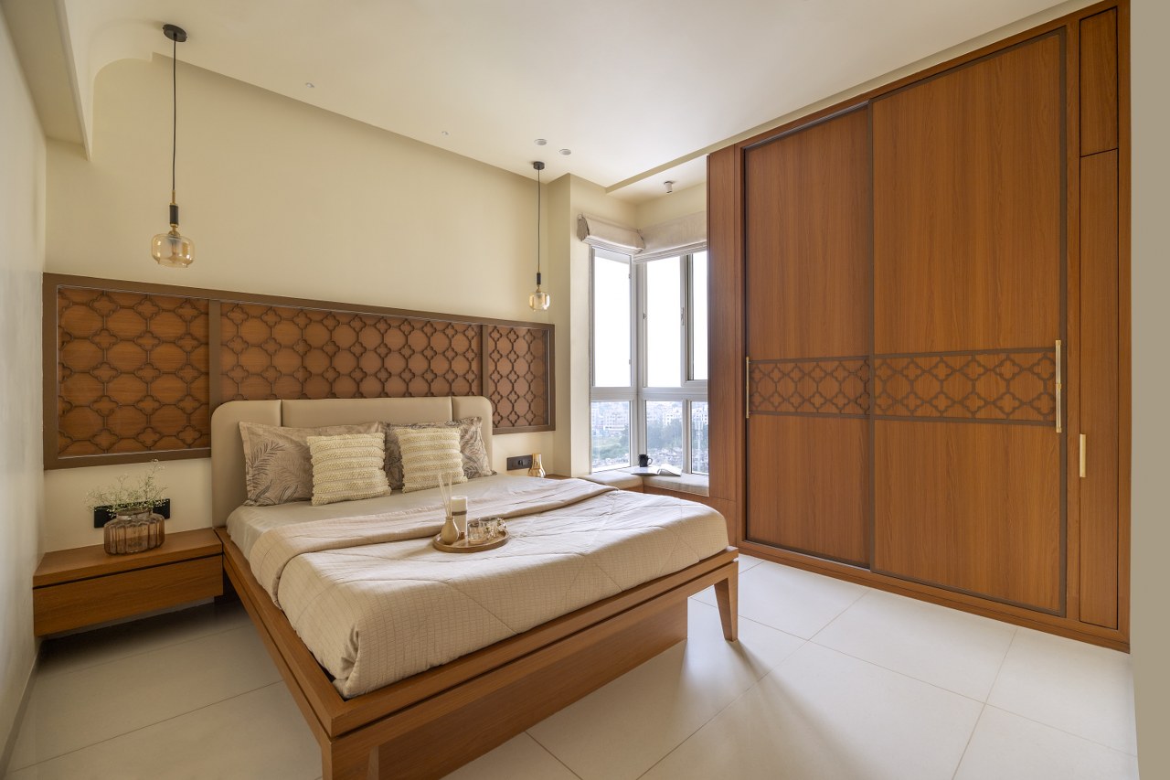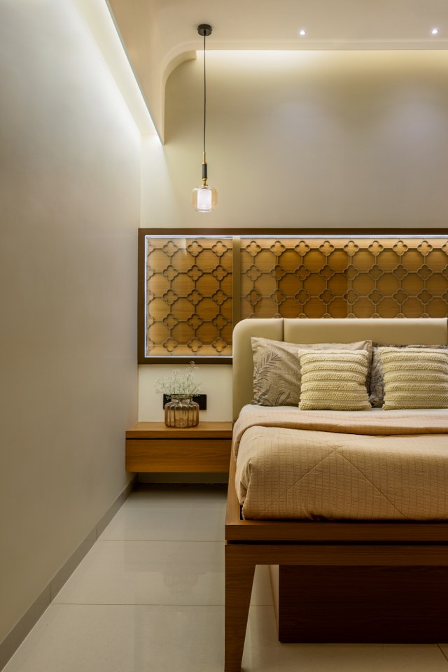 In contrast, the designers conceive the parents’ bedroom as a quieter, more rooted space. Drawing from their Suthar heritage, the room incorporates warm wooden textures and subtle traditional references that honour craftsmanship, values, and identity.