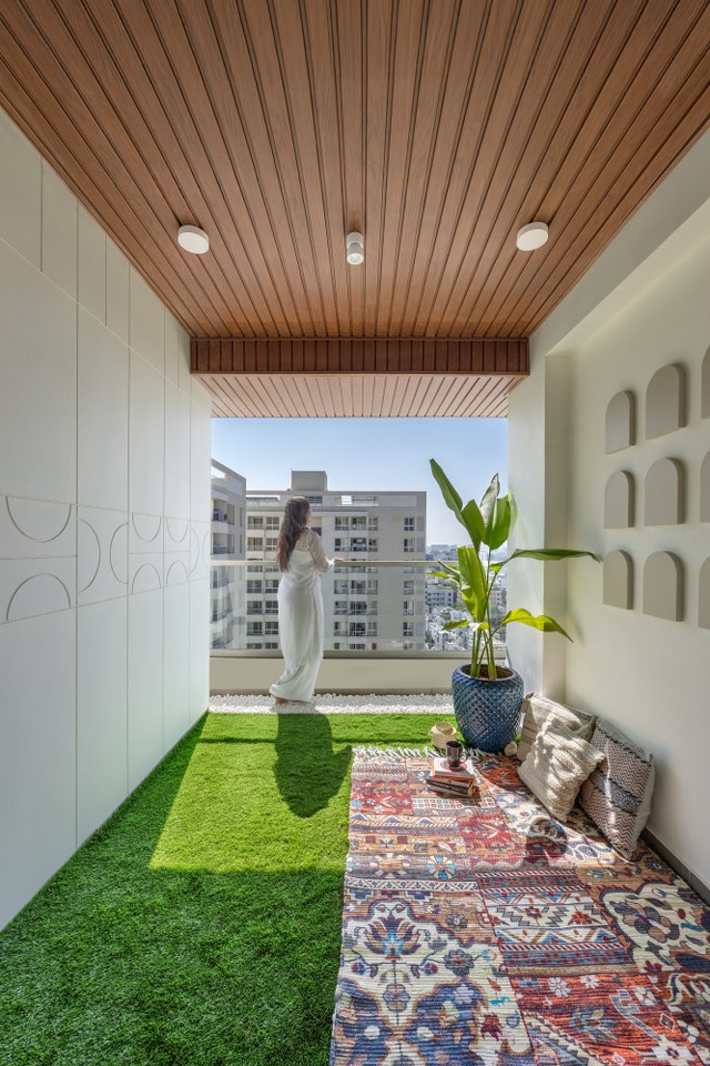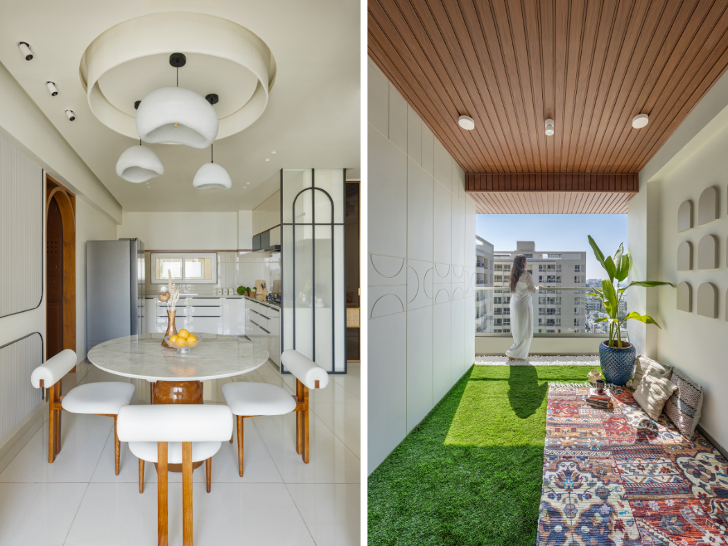 The designers create the living and dining areas as a single, cohesive volume and connect them visually to the balcony beyond. Rather than treating the balcony as a separate element, the interiors extend outward through aligned sightlines, restrained detailing, and consistent material choices.
