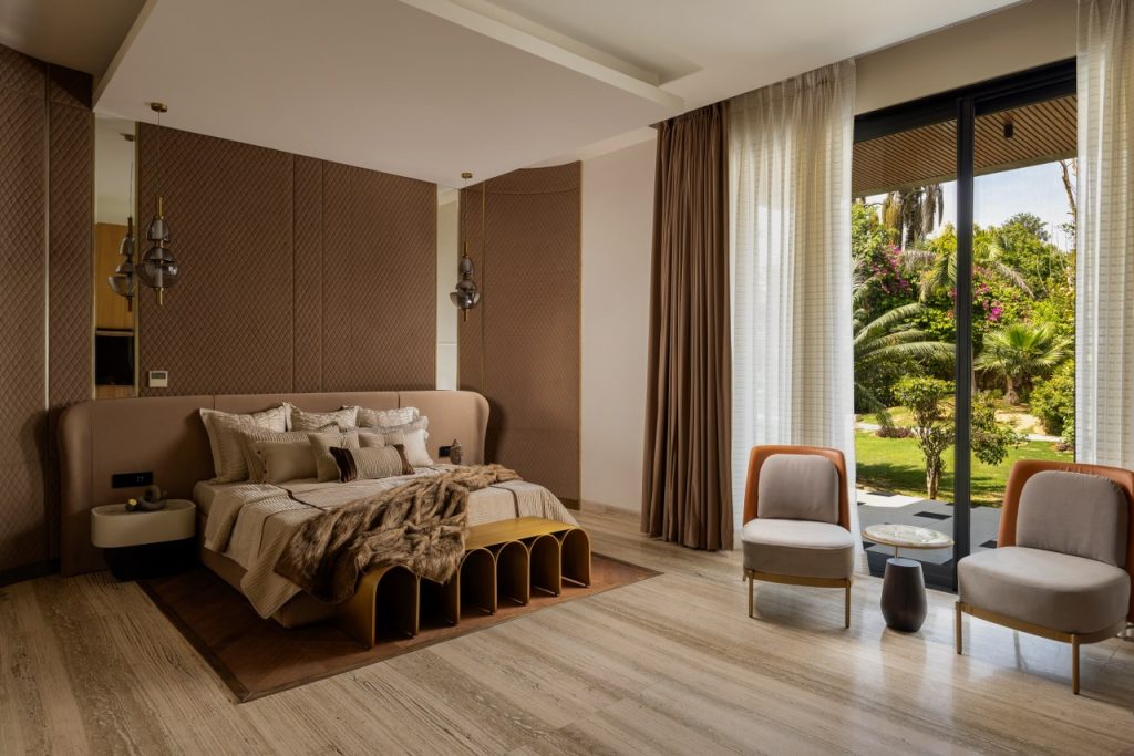 The mood intensifies in the Party Den. Here, velvet textures, a monolithic marble bar and a striking red lacquered fireplace create a space designed for long nights and deep conversations. The pool, once a constraint, was transformed into an indoor retreat through an intensive engineering process, adding an intimate pocket of calm.