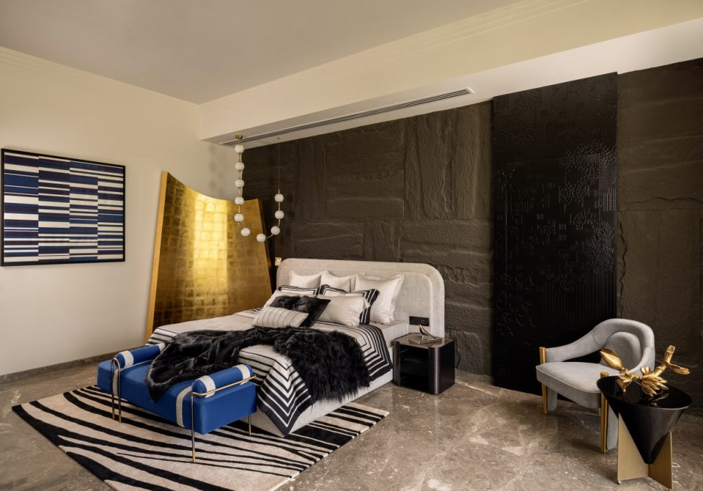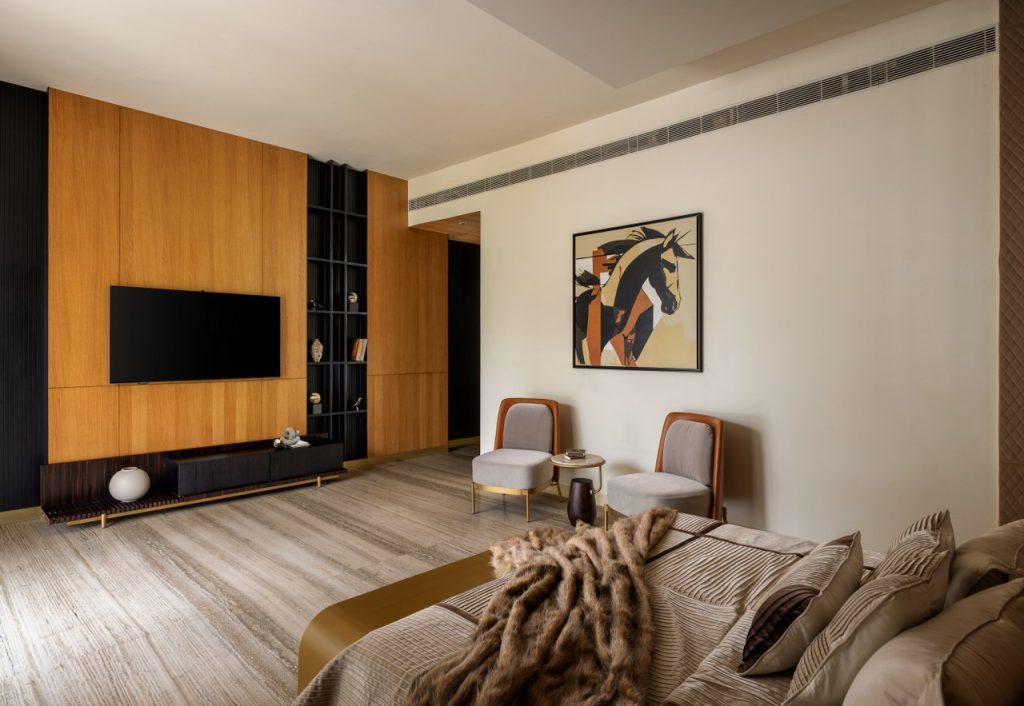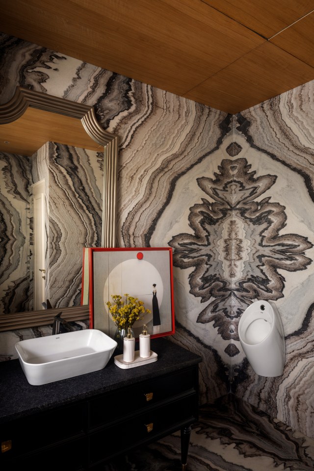 At the heart of the home, the Drawing Room embodies elegance. Custom furniture in muted tones sits against marble wall cladding that feels expressive and painterly. Brass accents appear subtly, adding quiet opulence, while a bespoke chandelier becomes a suspended sculpture.