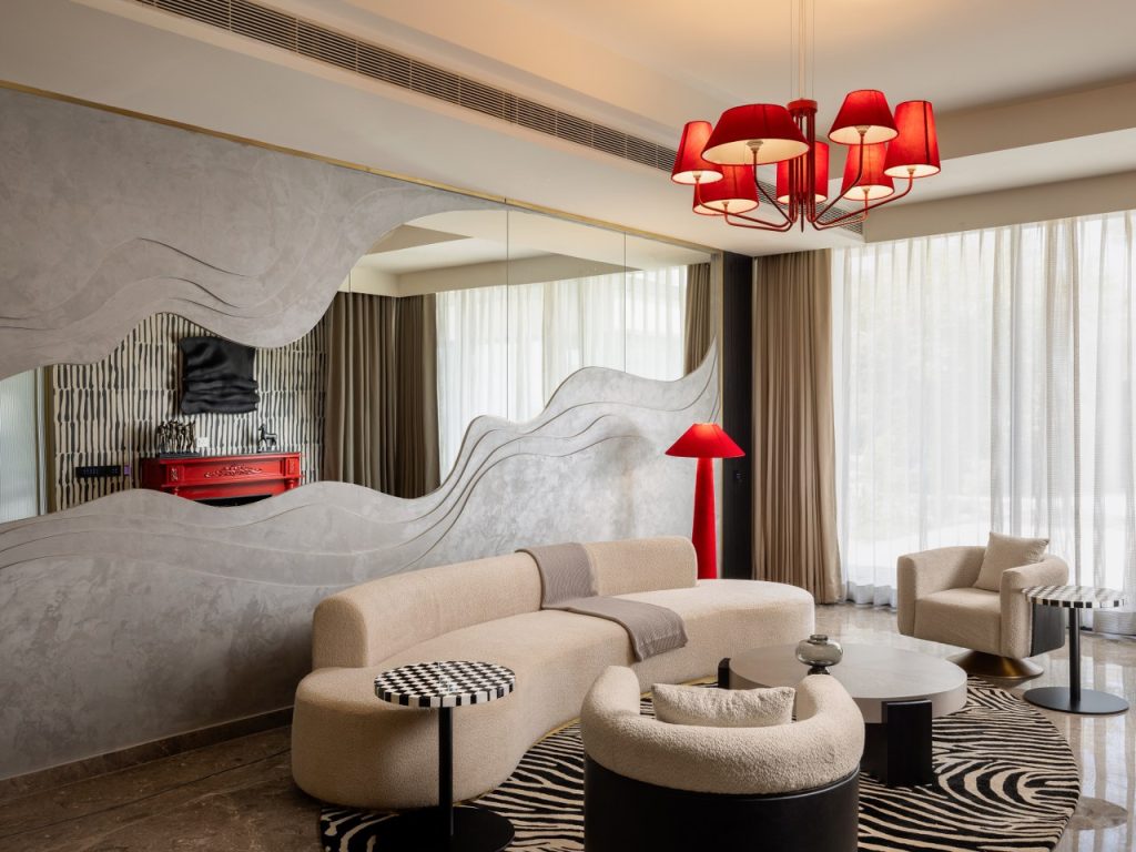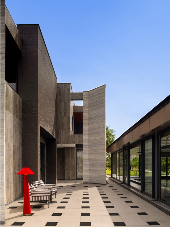 Within four acres of manicured greens, Zarrah rises as a residence that reimagines hospitality through architectural intent. Designed by Poulomi Dhar and Jatin Gupta, the home steps away from the idea of a traditional dwelling. Instead, it becomes a place designed for lingering, hosting, and creating moments, where comfort, tactility, and visual drama shape every experience.