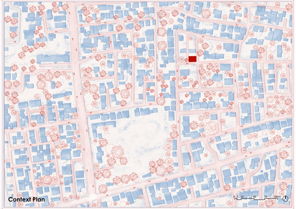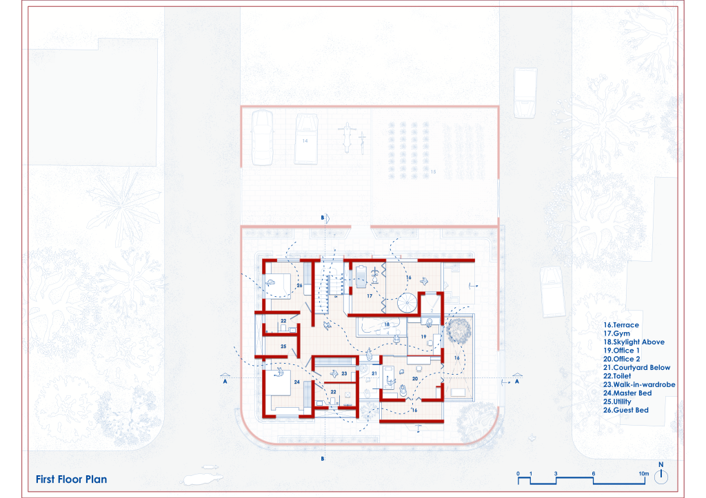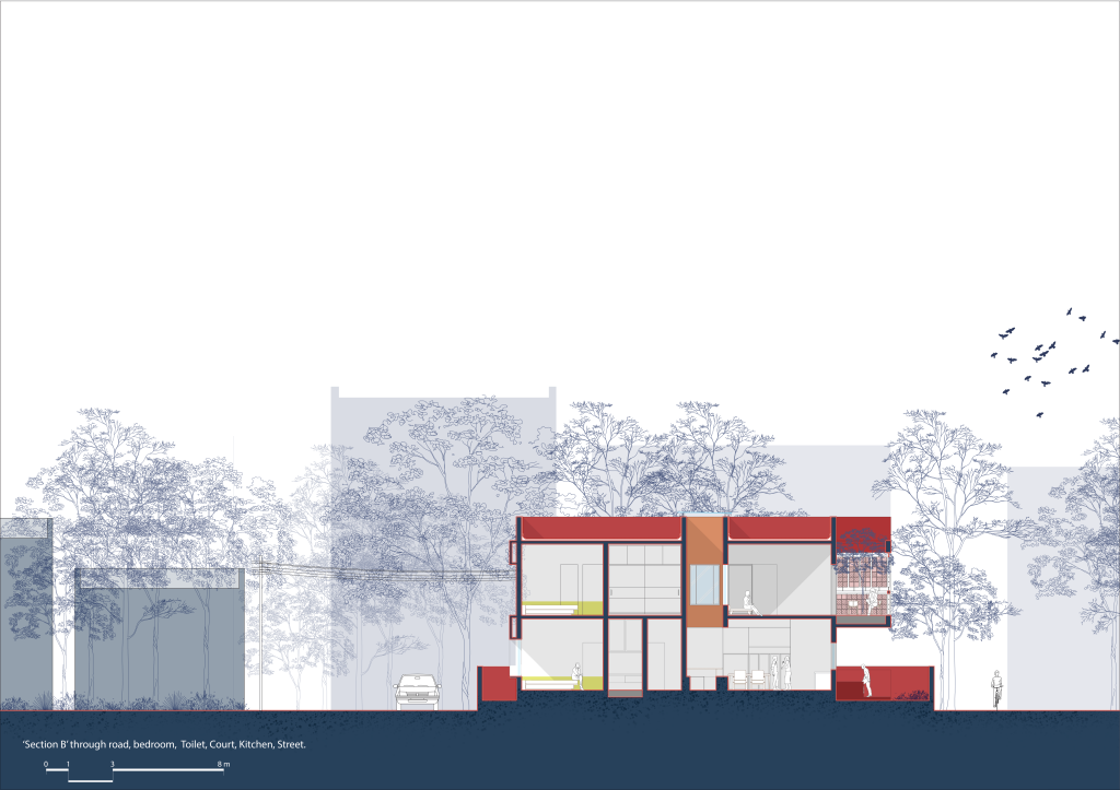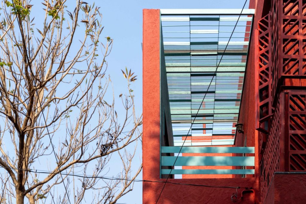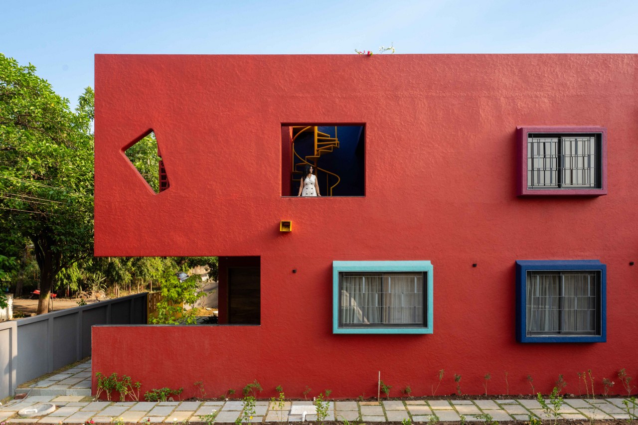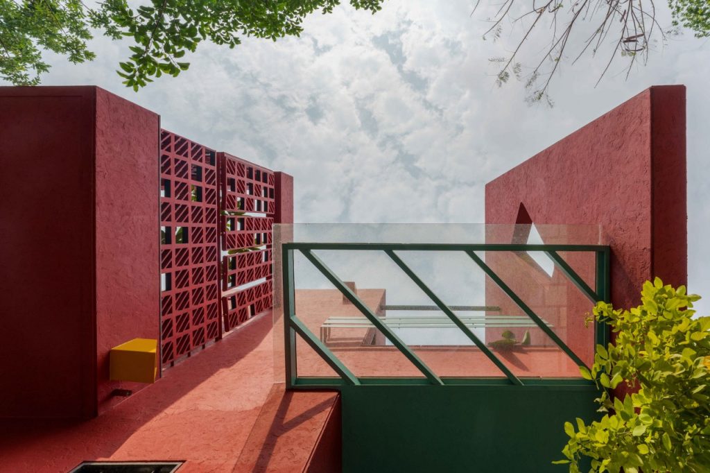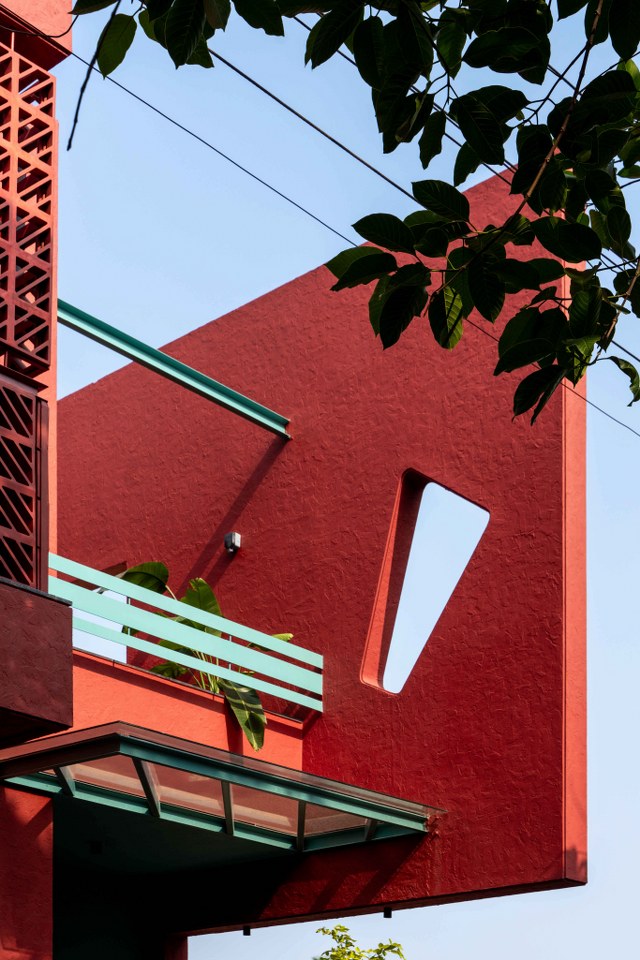 The residence with its red terracotta facade stands as a bold statement in its neighbourhood, its dramatic volume and vibrant facade drawing immediate attention. Clean geometric forms and dynamic cutouts break the massing, introducing visual depth and rhythm.