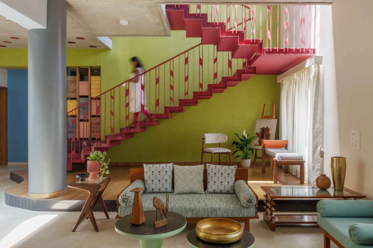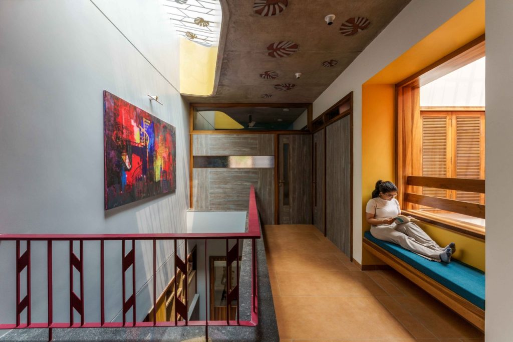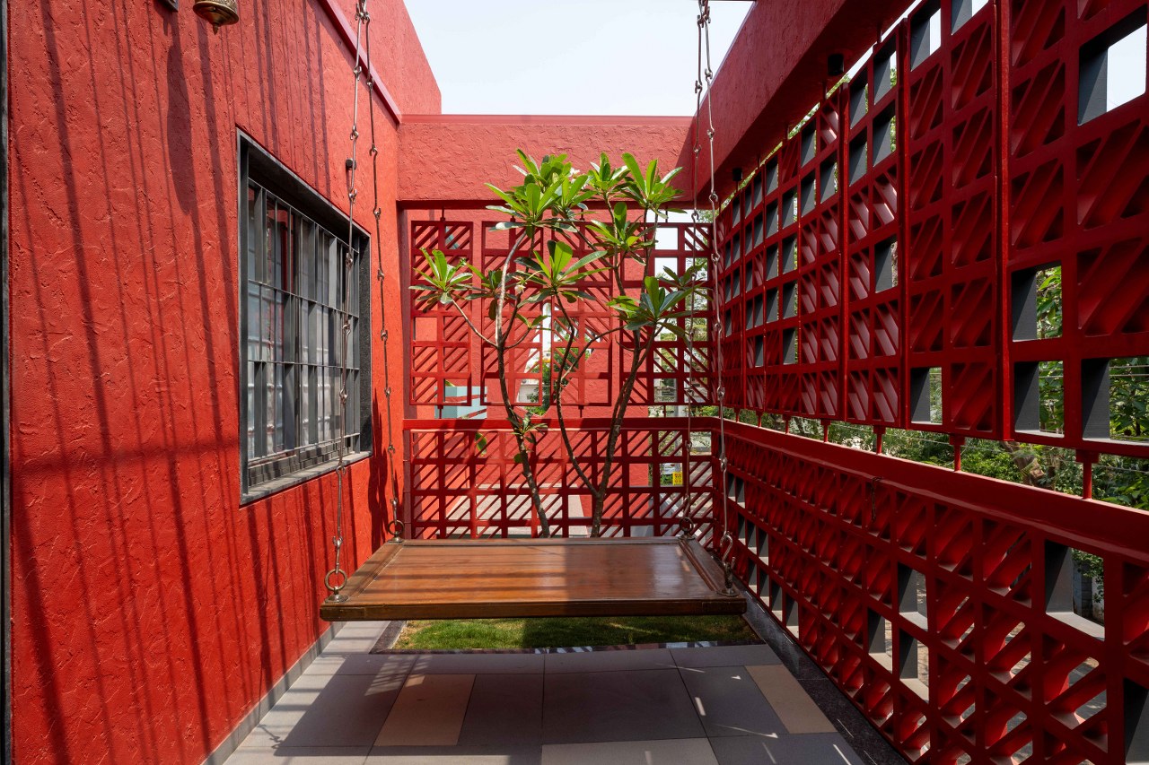 The red terracotta facade is further enhanced by a thoughtful interplay of bold primary colours and terracotta jalis, merging contemporary flair with cultural authenticity. The terracotta jali not only reflects India’s rich architectural heritage but also provides natural ventilation, shading, and privacy, contributing to the home’s sustainable design ethos.