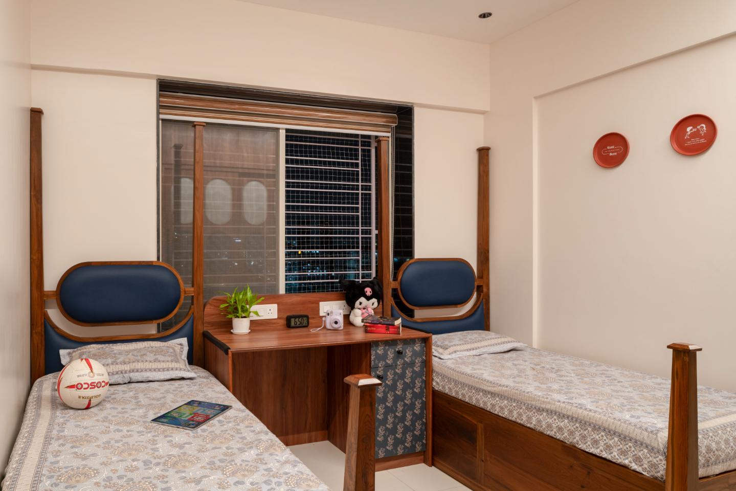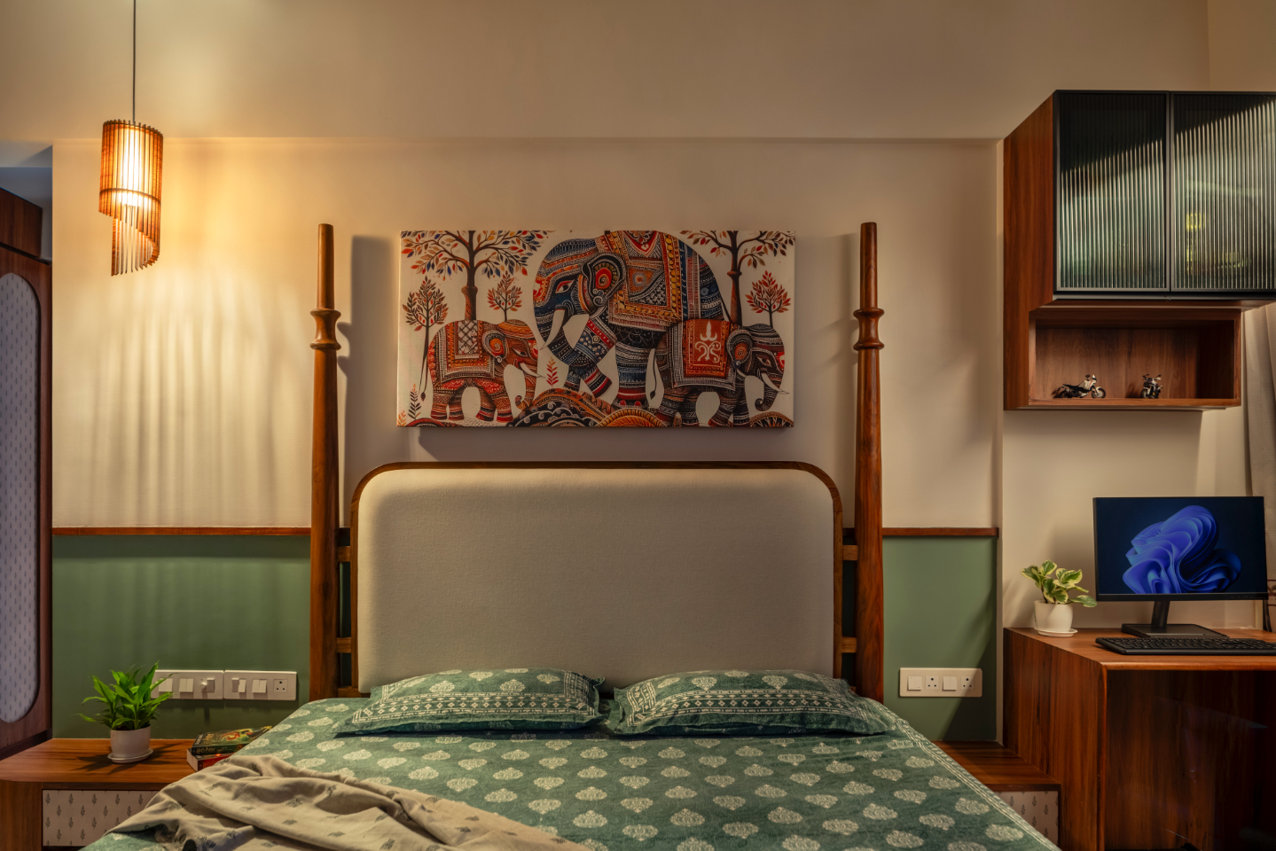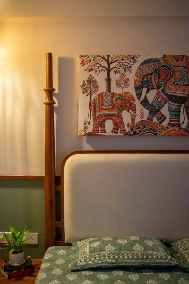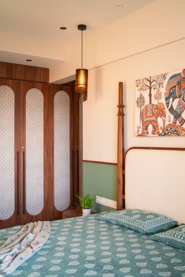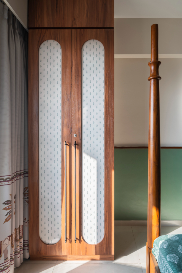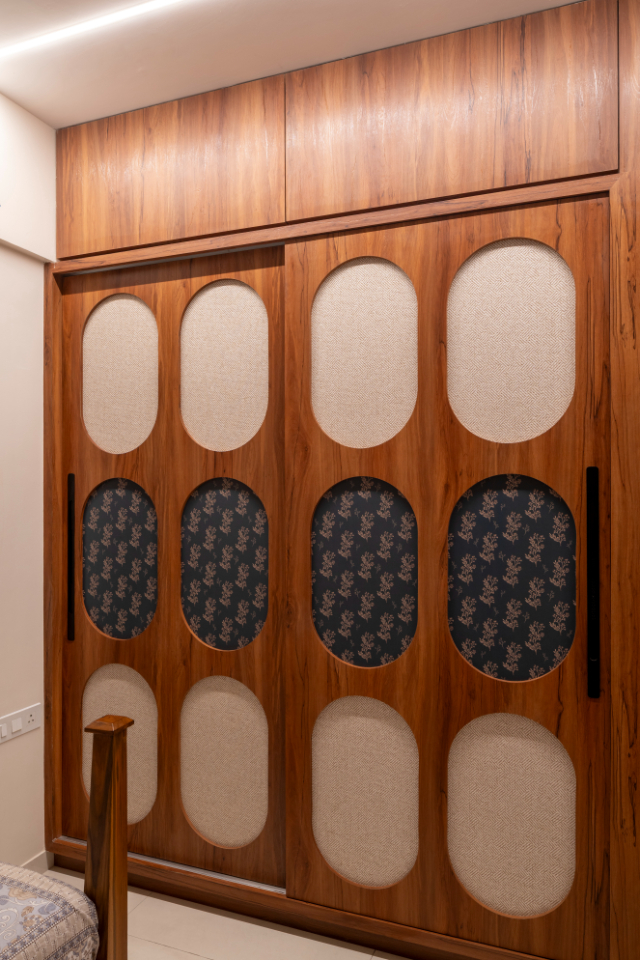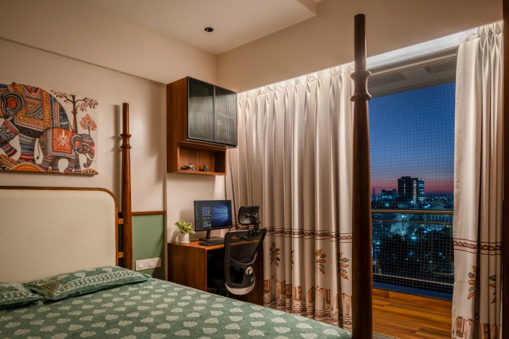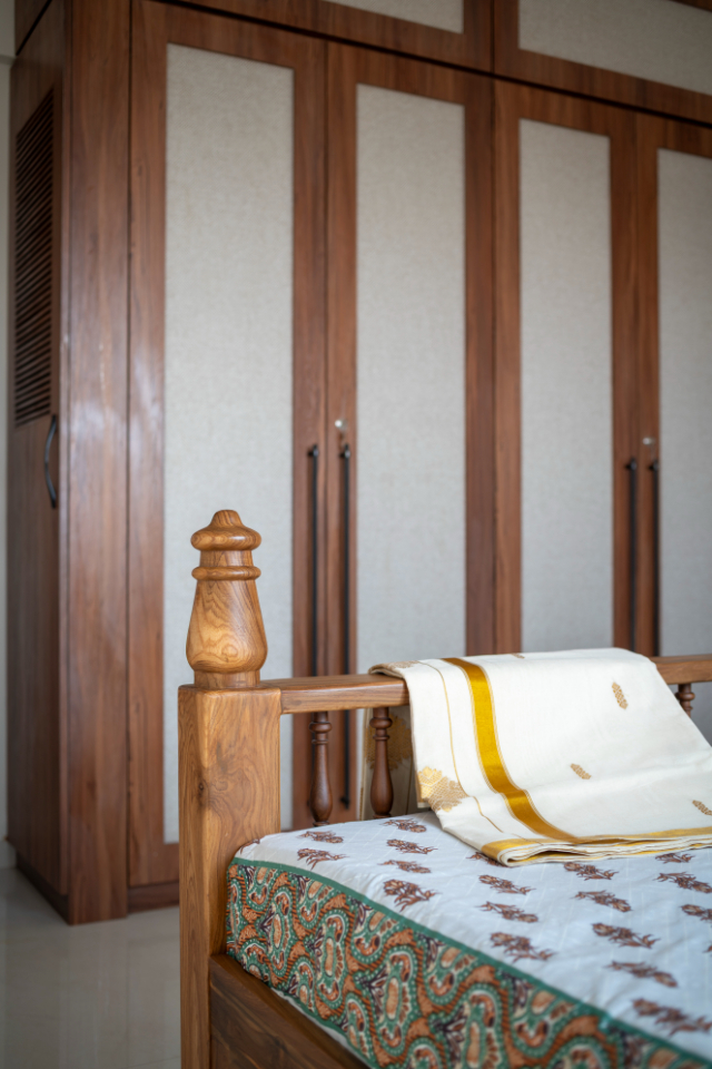 Moving into the private spaces, the bedrooms showcase the South’s legacy of wood carving through bespoke furniture pieces. The wardrobes are finished with a combination of warm wood and laminates featuring indigenous prints, ensuring the cultural thread runs through every corner of the residence.