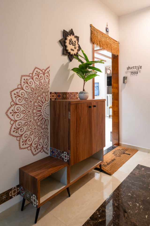 The concept was to bring the warmth of a traditional South Indian home into a modern city apartment. The goal was to blend two worlds. One of them was the nostalgia of the client’s roots and the practicality of their current urban lifestyle. It is a fusion where traditional materials meet modern shapes. It creates a home that feels culturally rich yet fresh and airy.