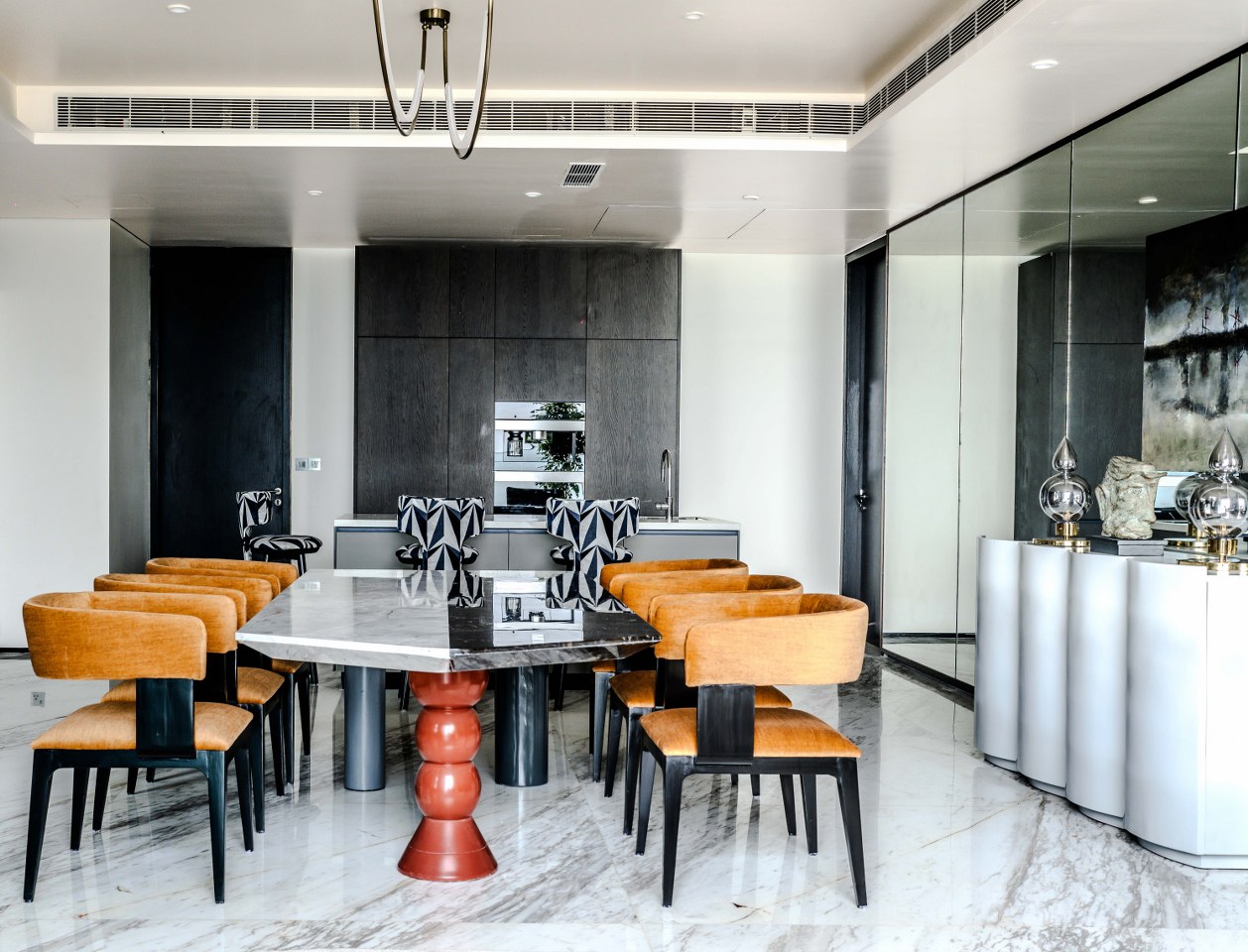 Luxury apartments often conjure images of serene beige palettes and minimalist furniture, but this project, Azure, stands apart as a true ode to modern contemporary homes, celebrating individuality and boldness. Spanning an expansive 8,000 sq ft, this home, conceptualised by Farah Agarwal of Chestnut Storeys, is infused with the warm, golden hues of the Bay of Bengal sunrise, creating an environment that exudes a sophisticated yet vibrant energy. Nestled high in the heart of the city, it transforms the concept of high-rise living into an elevated experience that offers both sanctuary and spectacle.