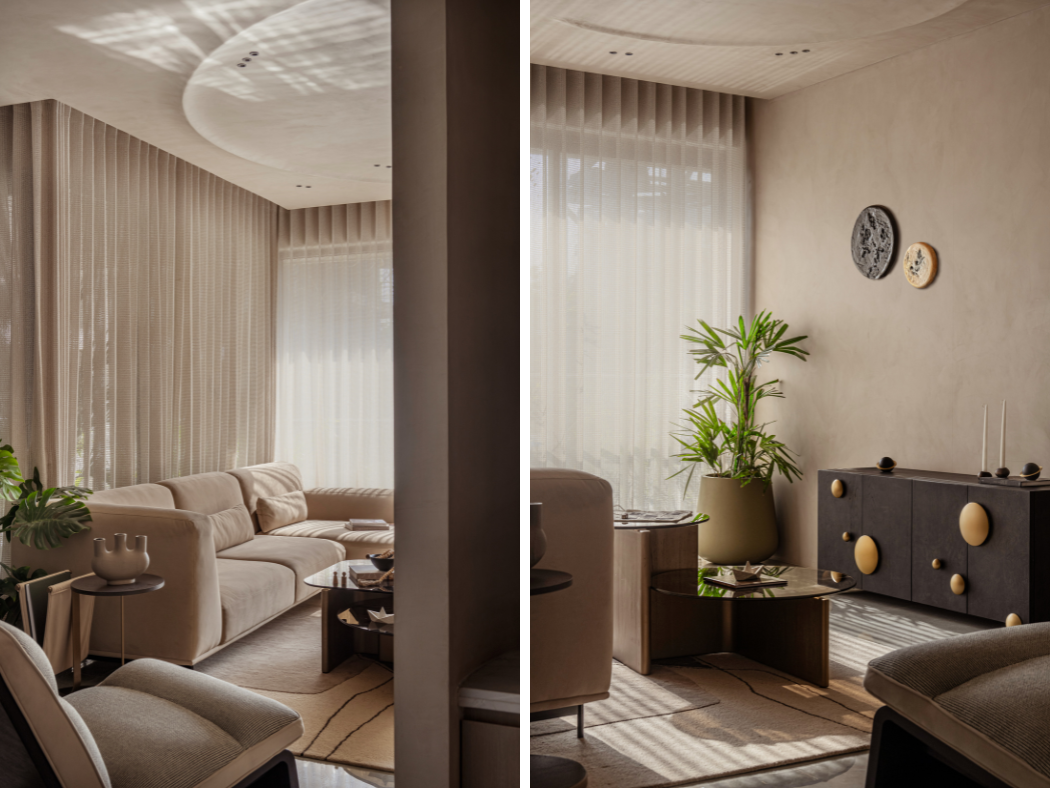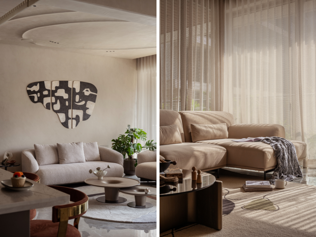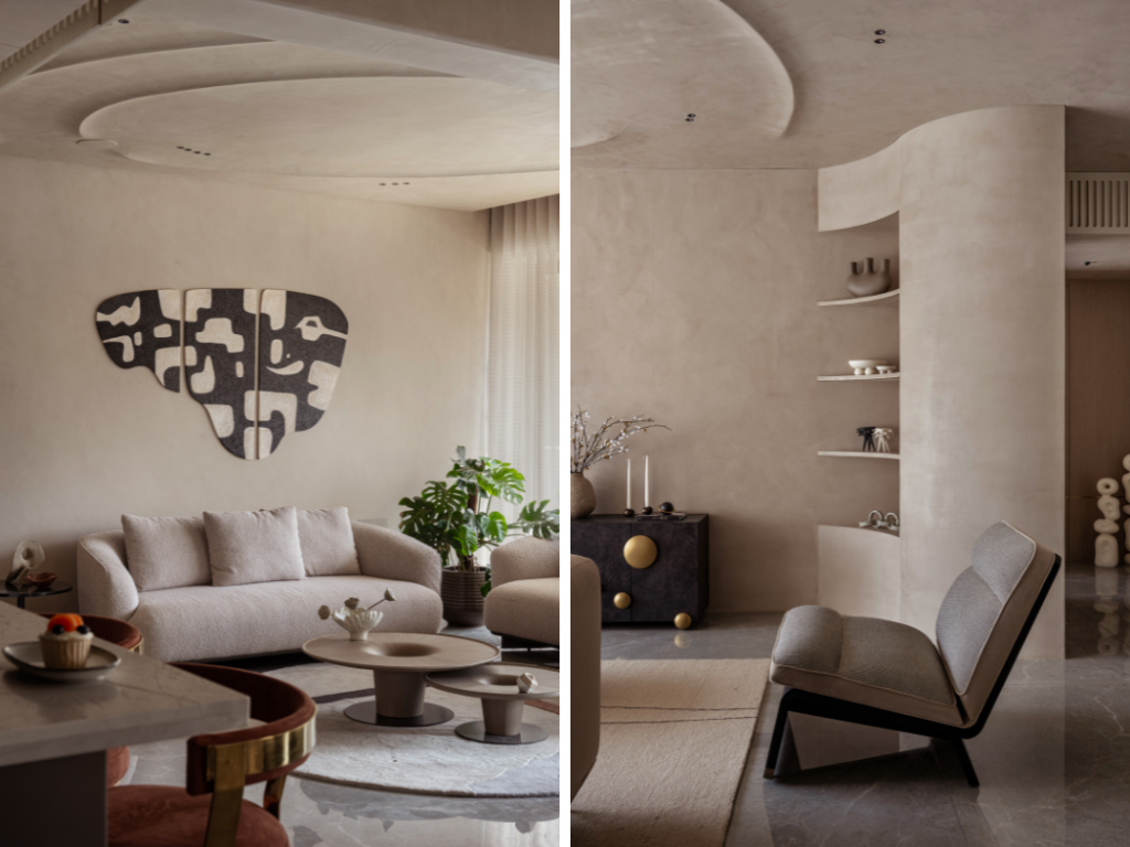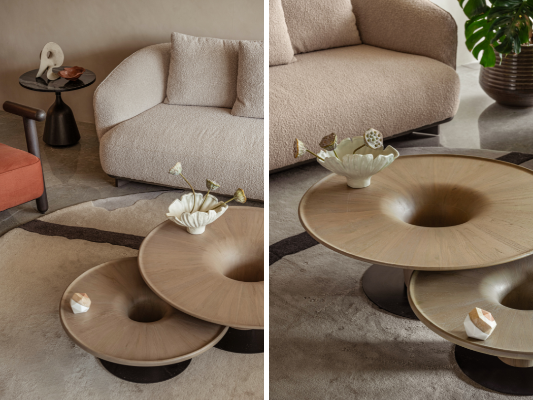 Within the neutral, curvilinear shell, high-impact design details introduce necessary contrast and structure. The furniture selection operates on the principle of “art as function.” Nested wooden coffee tables, carved into hollow, torus like shapes holds center stage. These sculptural forms mirror the organic flow of the ceiling above. Thus, grounding the room in a quiet sophistication and bespoke interiors.