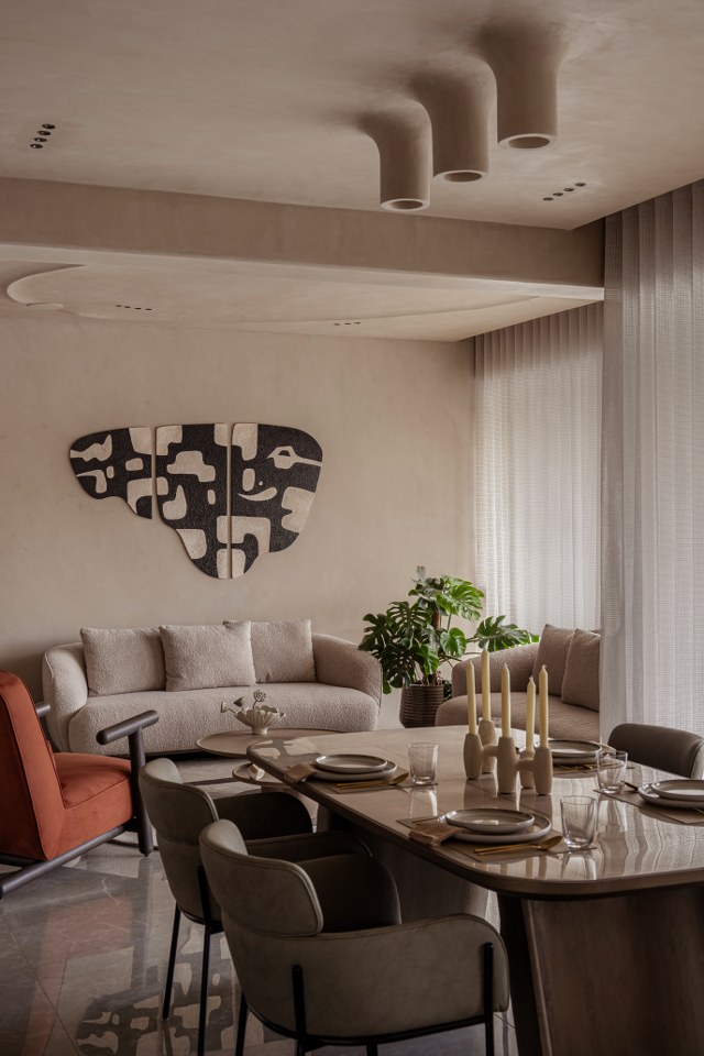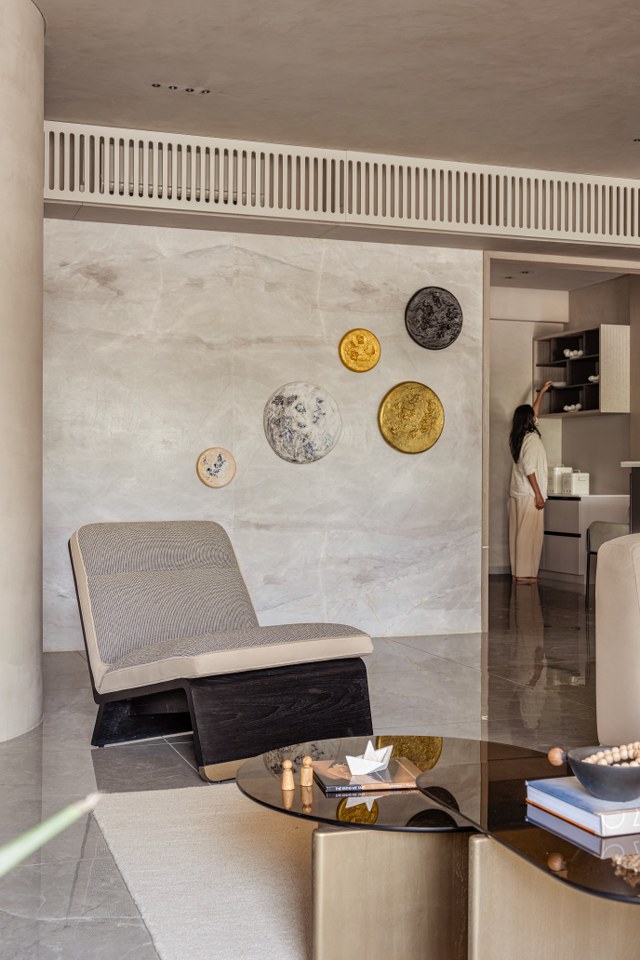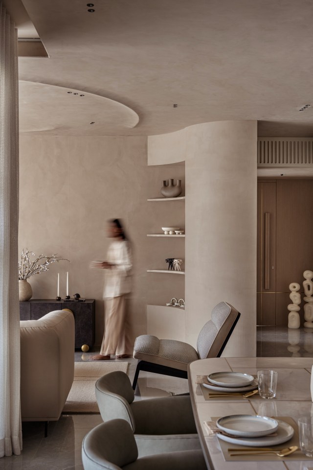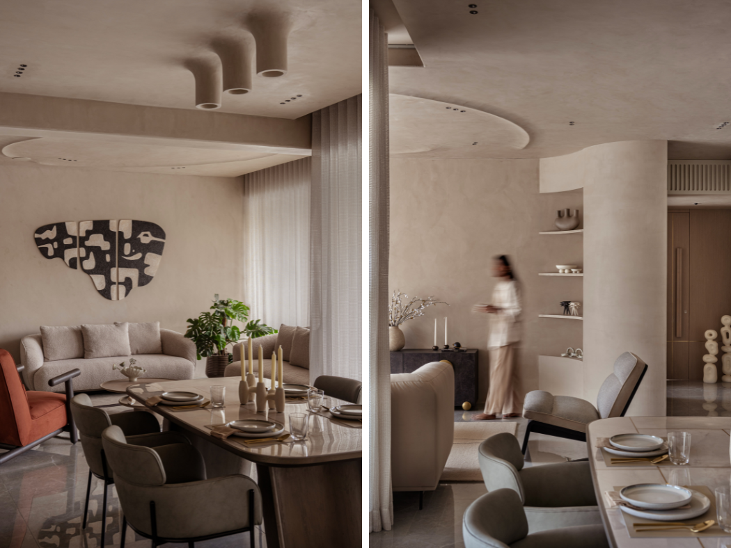 The architects enveloped the primary public spaces in Microconcrete textured walls, lending a monolithic softness that makes the structure itself feel pliable. In a move that celebrates necessity, they rounded a massive structural pillar in the dining area into a gentle, flowing curve. They integrated bespoke shelving and transformed a structural requirement into a sculptural anchor. “The aim was to make the bespoke interiors design breathe. We didn’t want walls; we wanted soft volumes, sculpted by light, not by corner.”