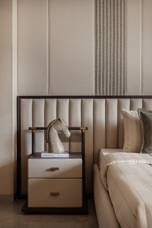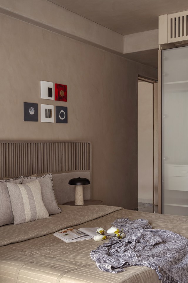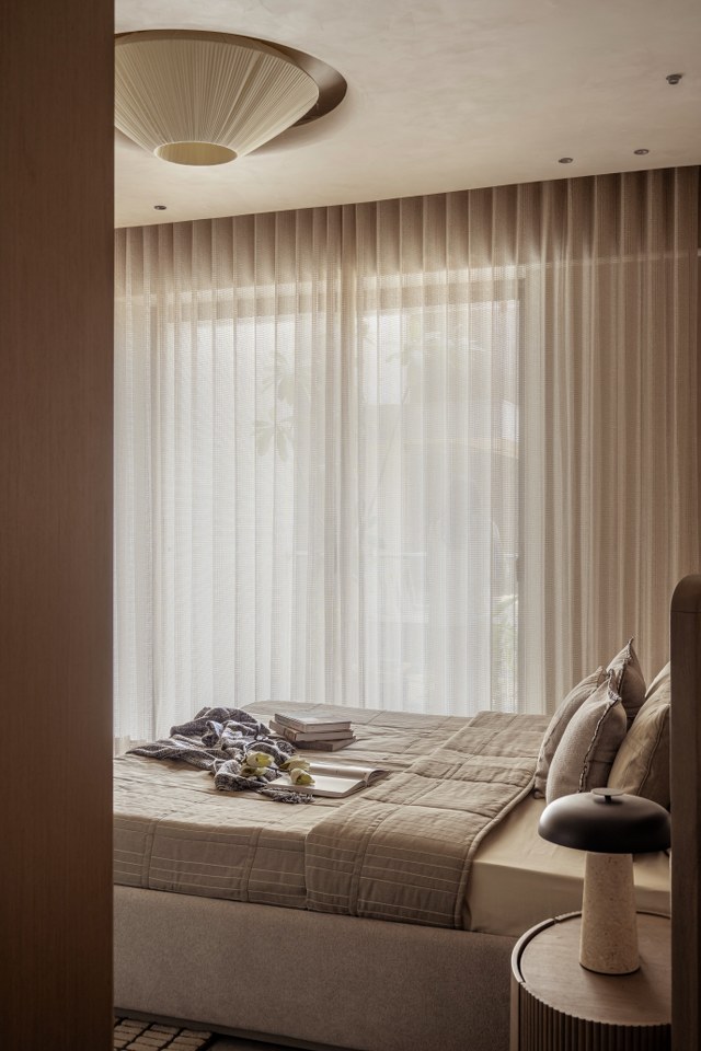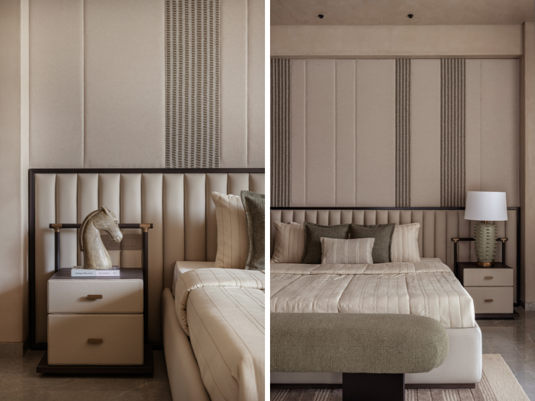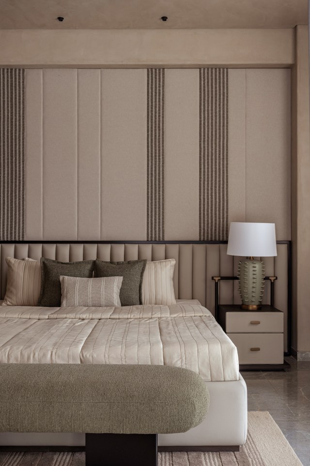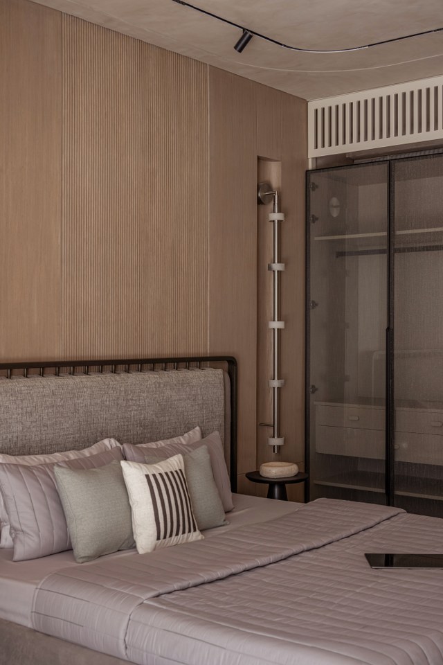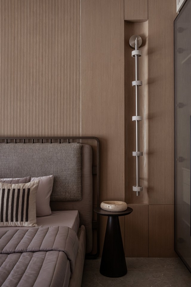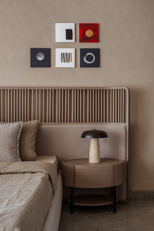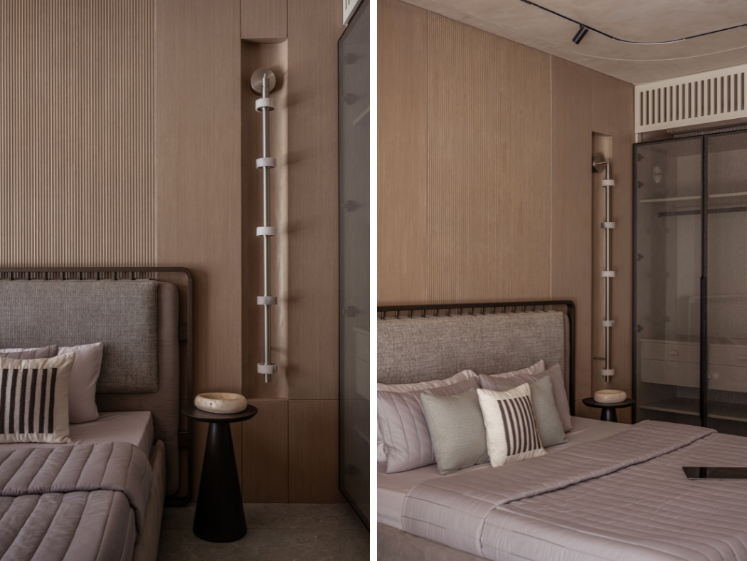 The “curvilinear” ethos flows seamlessly into the private quarters, adopting a more intimate and tactile register. The bedrooms elevate the experience through intricate paneling and textured details:● Rhythmic Verticality: One suite features floor-to-ceiling vertical striped paneling, artfully paired with a dramatic curved, suspended light fixture to heighten the sense of space and rhythm.● Slatted Warmth: Another sanctuary utilizes a spindle-style headboard, where thin wood slats create an impression of transparency and airiness, flawlessly flanked by charming mushroom-profile bedside lamps.