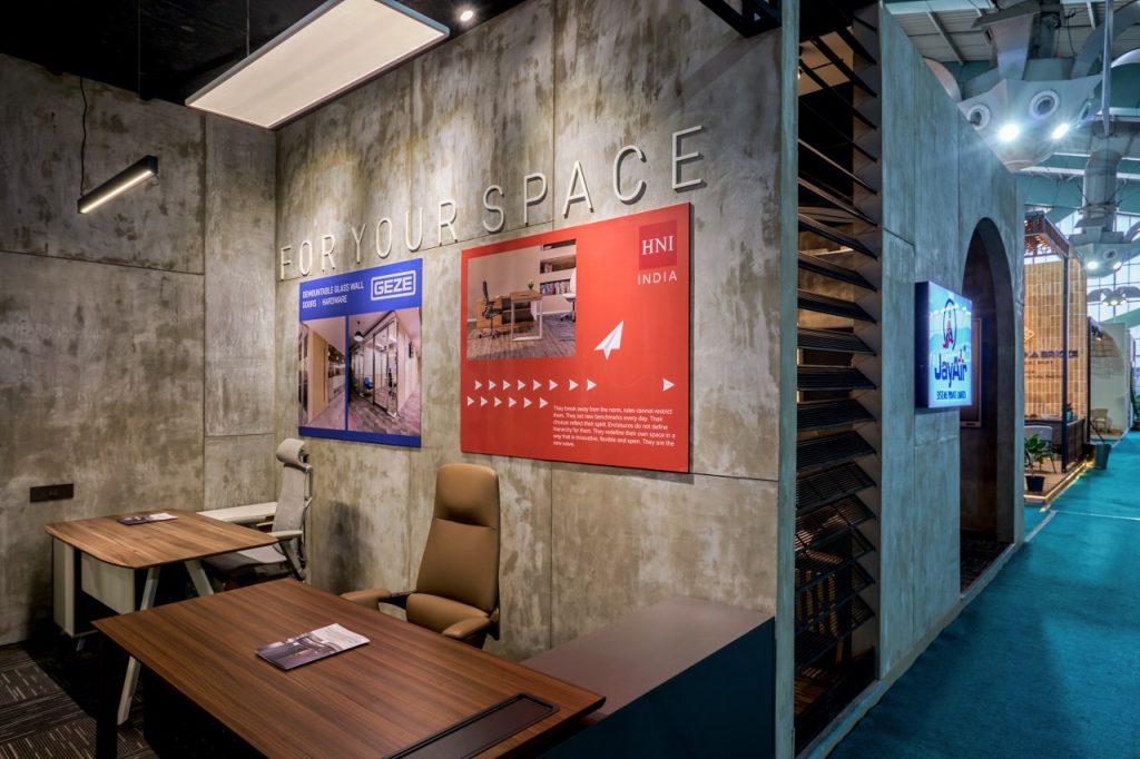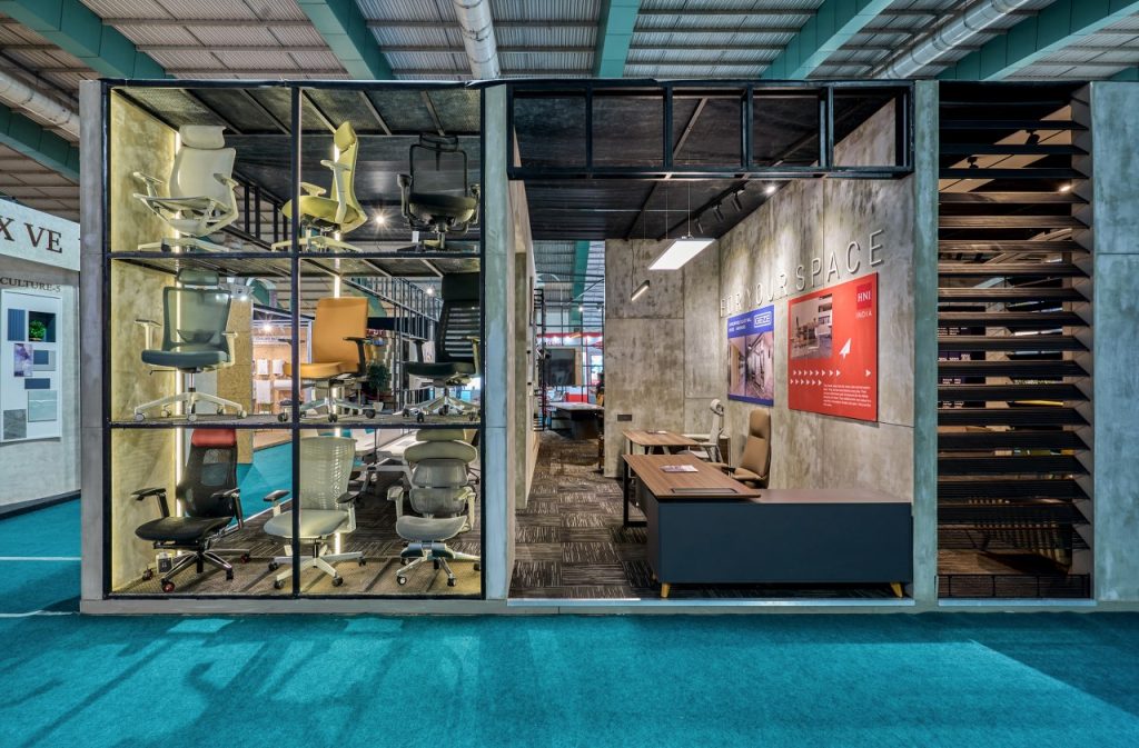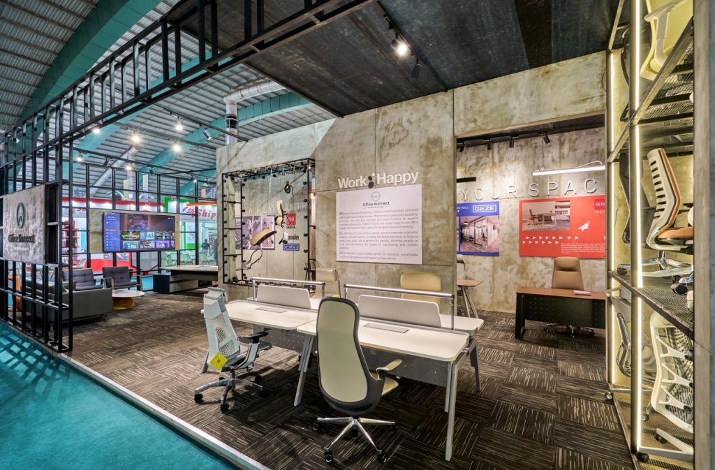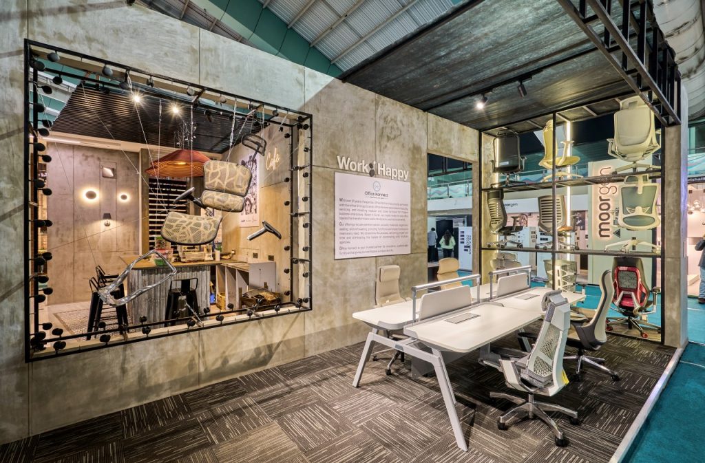 The stall was structured around synergy. Office Konnect furnished the entire space, integrating modular desks, task chairs, and lounge seating that doubled as discussion pockets. A deconstructed office chair installation became a sculptural focal point.