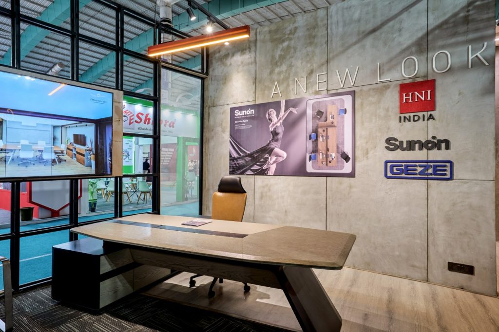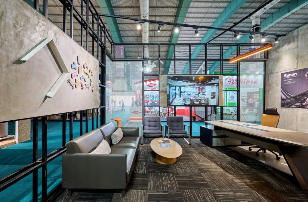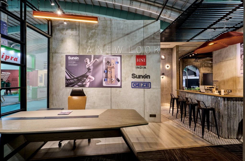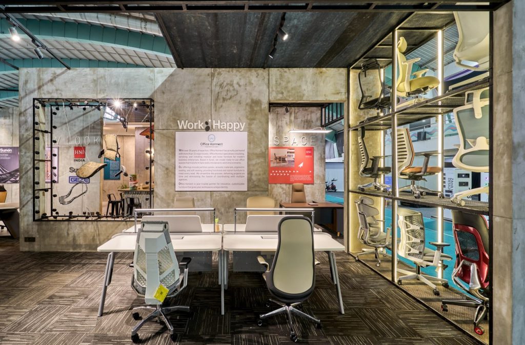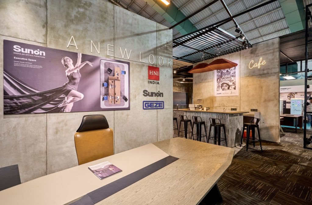 The stall was structured around synergy. Office Konnect furnished the entire space, integrating modular desks, task chairs, and lounge seating that doubled as discussion pockets. A deconstructed office chair installation became a sculptural focal point.