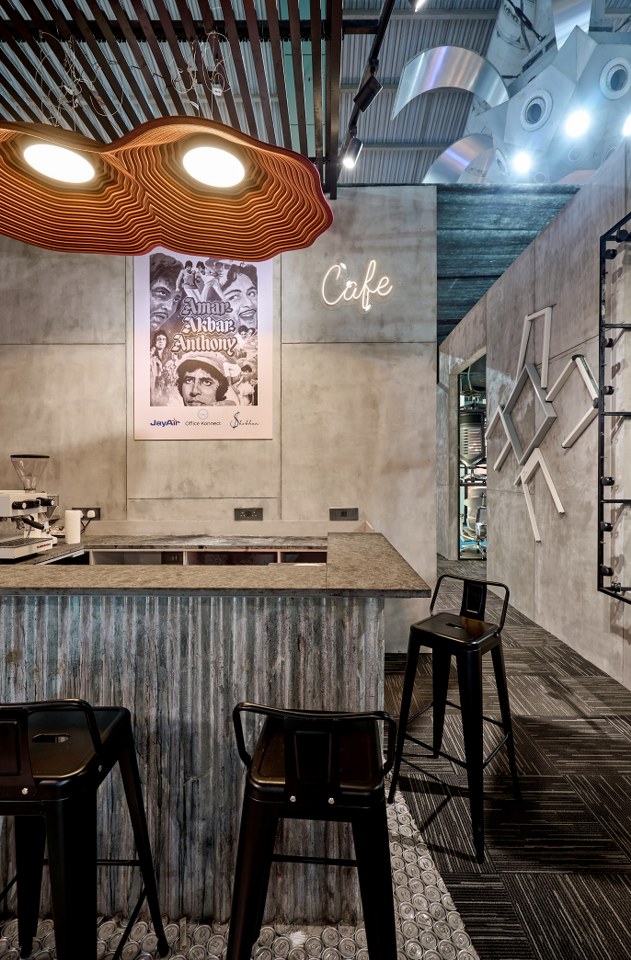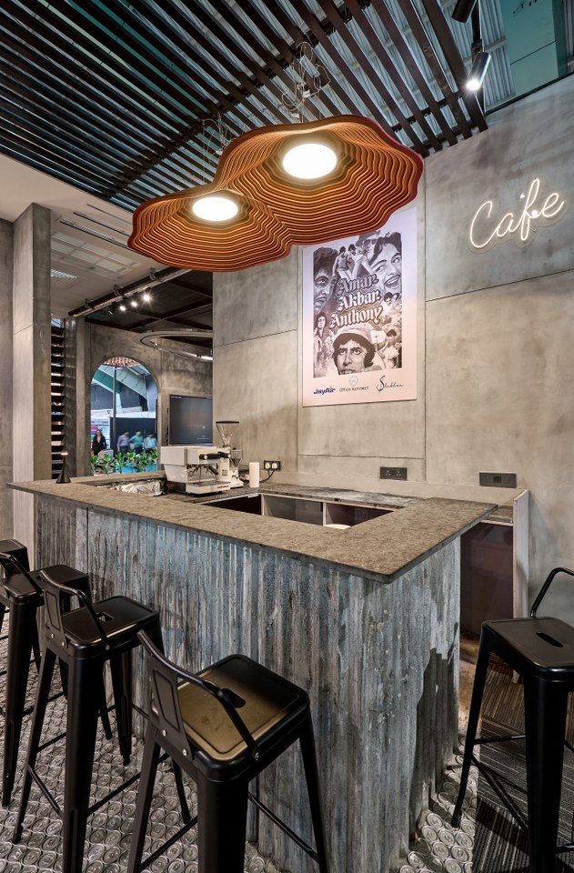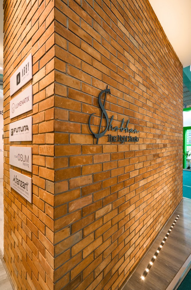 Shobhan The Light Studio illuminated the entire environment, with a statement feature light above the café table acting as the spatial anchor, while façade lighting was demonstrated against a brick-clad feature wall. Jai Air introduced repurposed AC louvers as permeable partitions and display panels, and installed a sculptural, amoeba- shaped “flow bar” that translated airflow into form.