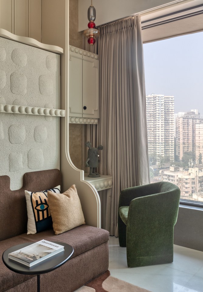 The children’s room is a poetic fusion of function and narrative. Foldable elements like a hidden bed maximize space, while a cacao-toned sofa and layered materials offer playful sophistication.