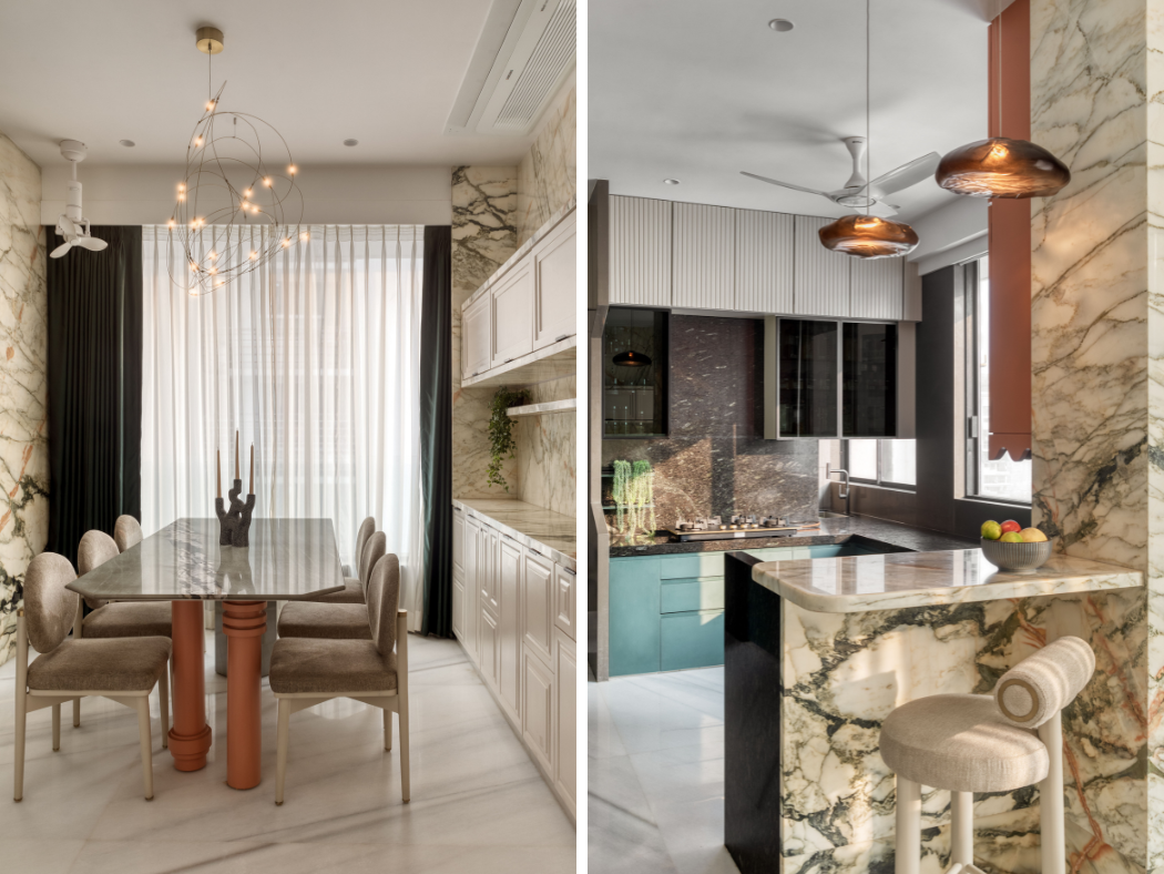 The dining area becomes a sculptural moment of calm drama. A marble tabletop, subtly asymmetrical, rests on terracotta-column bases — conjuring both ancient architecture and modern restraint. In the living space, a floating kinetic wire light hovers like a celestial drawing, animated and weightless, bringing contrast to the solid geometries below. In the contemplative nook, vertical fluting on walls, brass-accented cabinetry, and a graphic rug come together in an elegant rhythm — one that invites solitude without austerity.