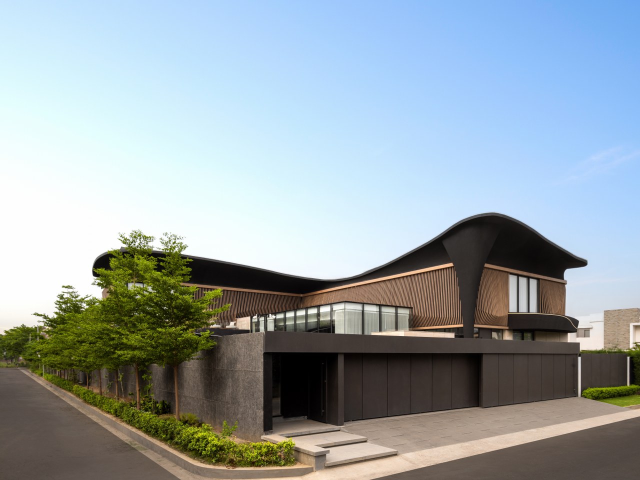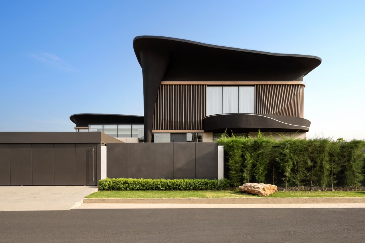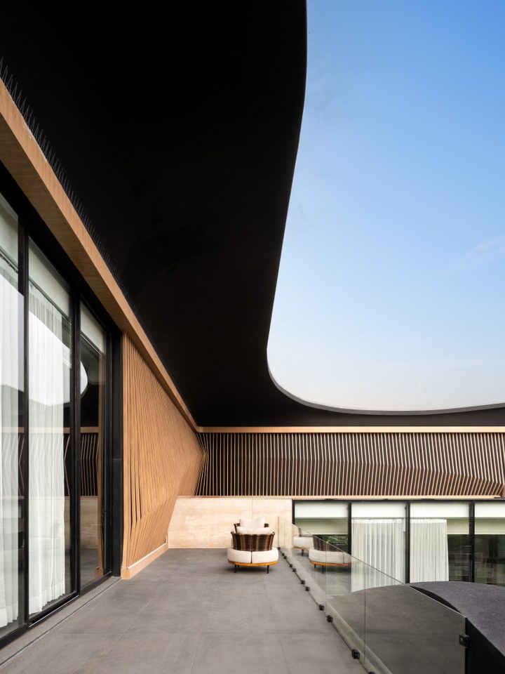 Upstairs, the son’s suite is the most visually expressive, featuring a floor-to-ceiling curved glass windows that opens to broad vistas. A walk-in wardrobe and private balcony complete the experience. Additional guest and children’s rooms, each with their own balconies, ensure that light and openness touch every corner of the upper floor. The layout upstairs balances openness with privacy and acts as part of the larger story.