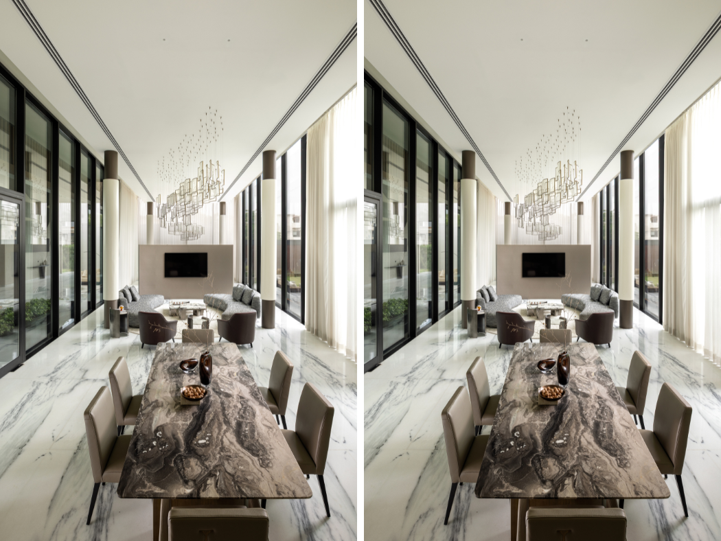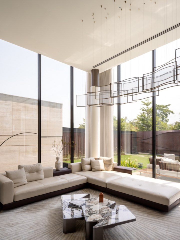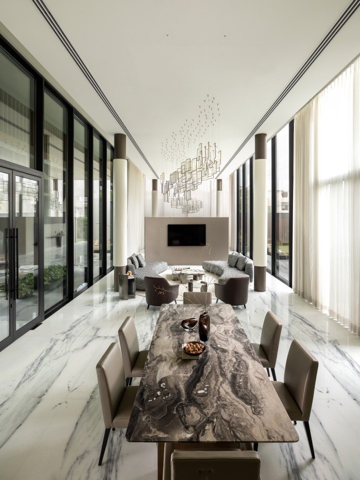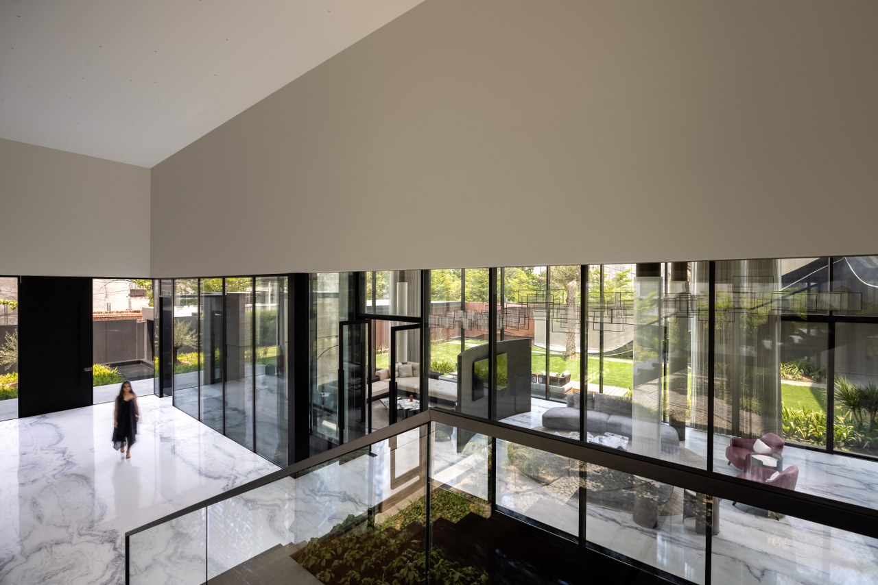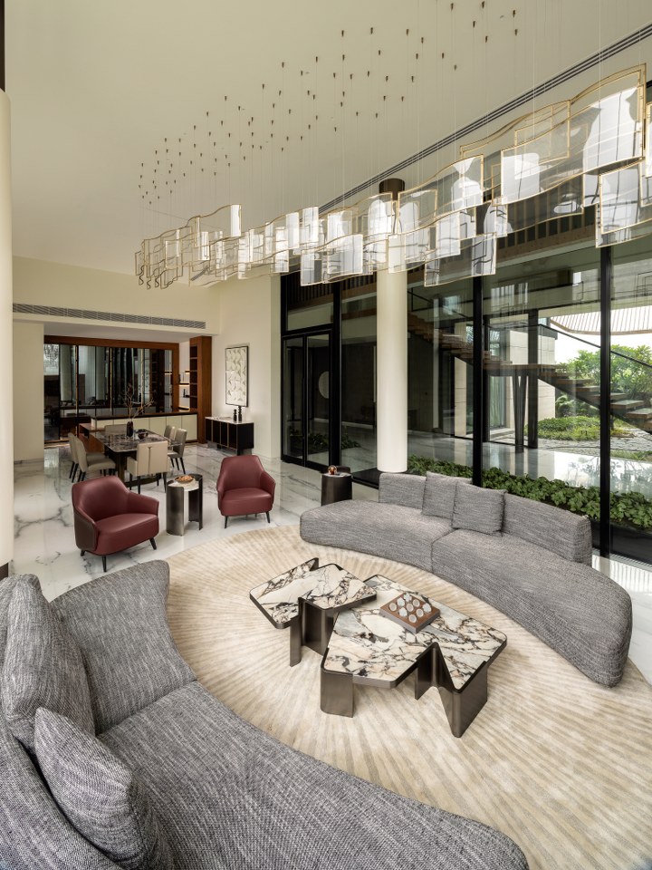 The master suite opens into this courtyard, benefiting from design elements like indirect light and privacy. The use of textures, muted tones, and organic finishes enhances the restful character of the room. An open riser staircase is placed within the entrance foyer, maintaining visual continuity between floors without interrupting the flow. Moving along the central spine, the built mass transitions into a voluminous living area. Defined by a soaring double-height rectangular glazed form, referred to as the Crystal Volume, this space functions as the home’s visual and spatial climax. It blurs boundaries between indoor and outdoor, between built and natural, anchored by a central chandelier suspended like a floating jewel.
